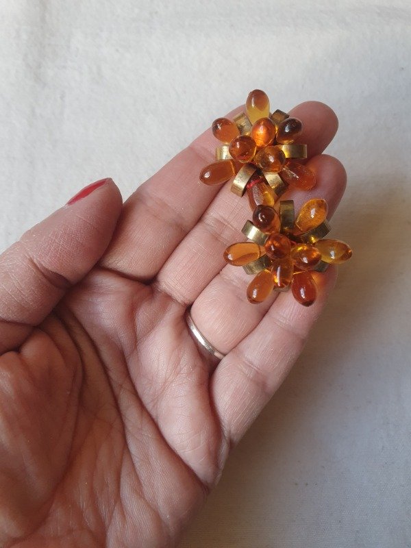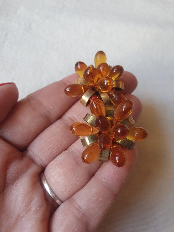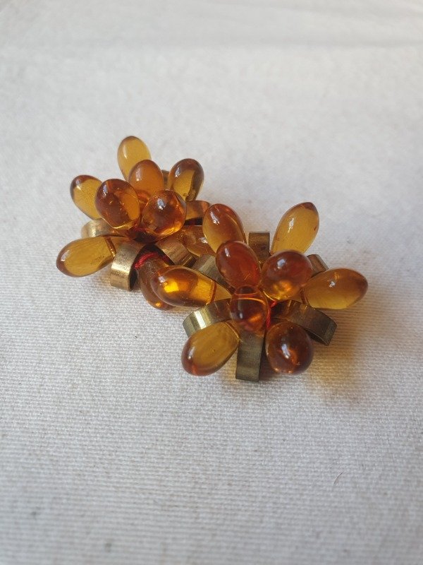 Clips 40s rosetas con gotitas de cristal ámbar y detalles en bronce