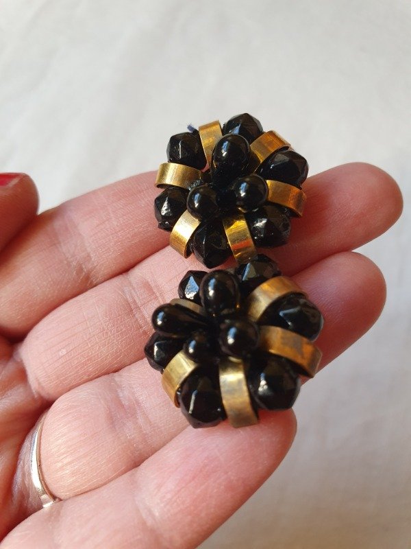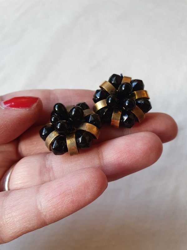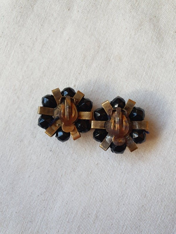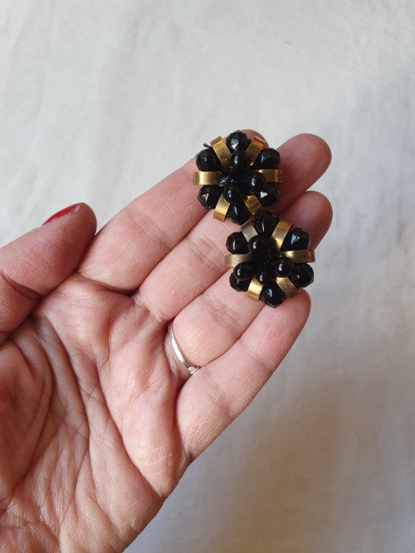 Aros clips 30s-40s Art Déco muy early Ch4nel con forma de florcitas de perlitas de cristal y gotitas de vidrio negras con detalles en bronce