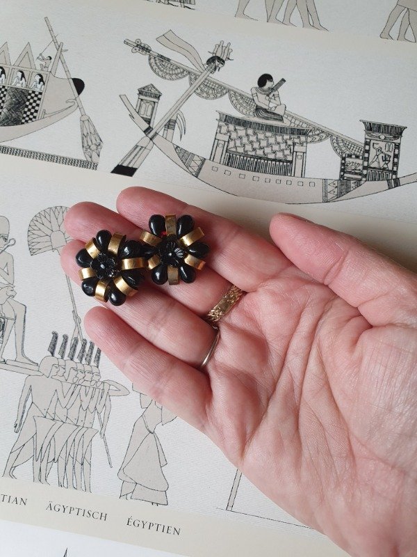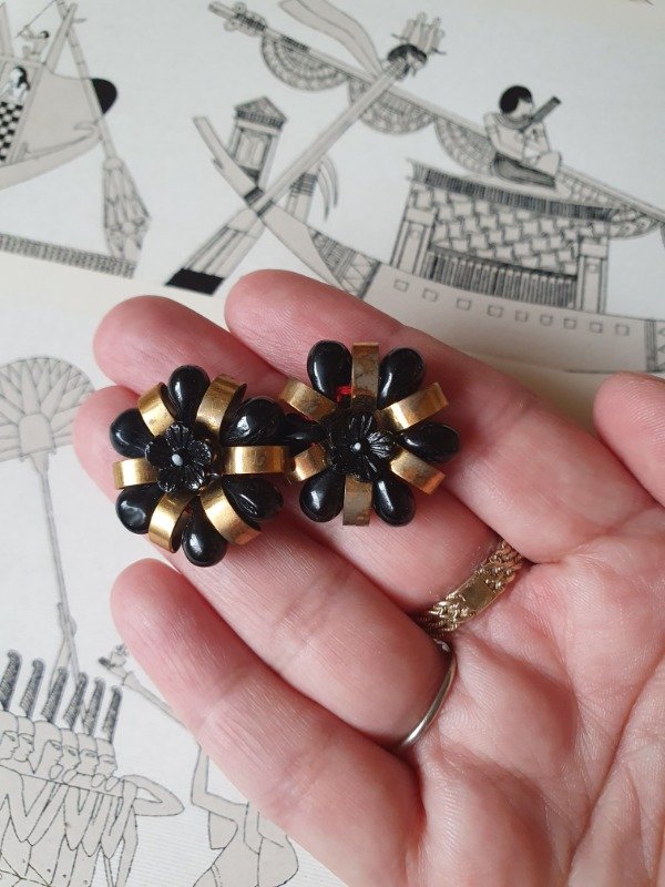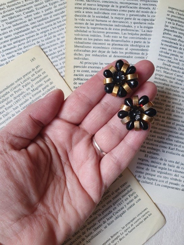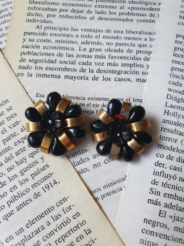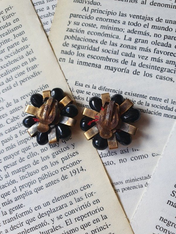 Aros clips 30s-40s Art Déco muy early Ch4nel con forma de florcitas de perlitas de cristal y florcita de vidrio negra con detalles en bronce