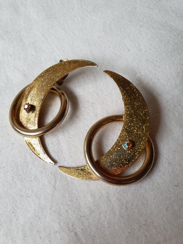 Están realizados en material metálico dorado recubierto en resina con glitter y tienen una piedrita aurora borealis de adorno.