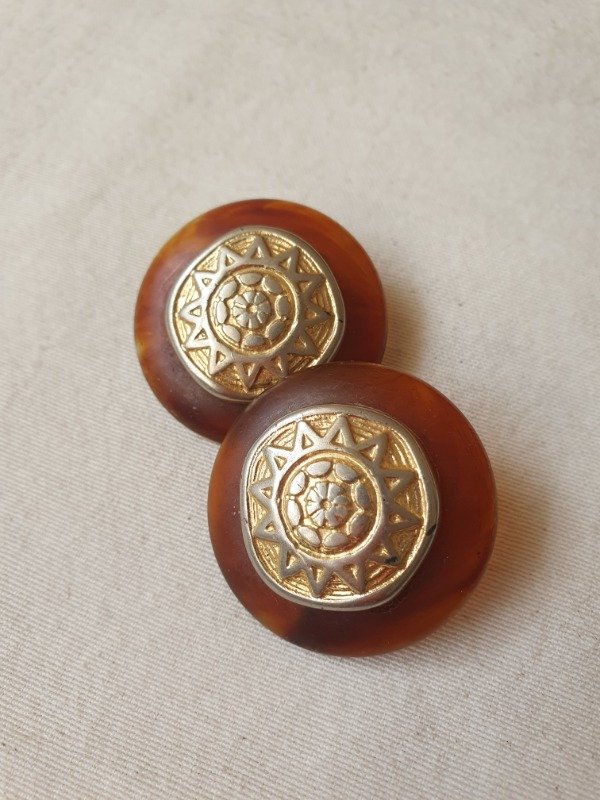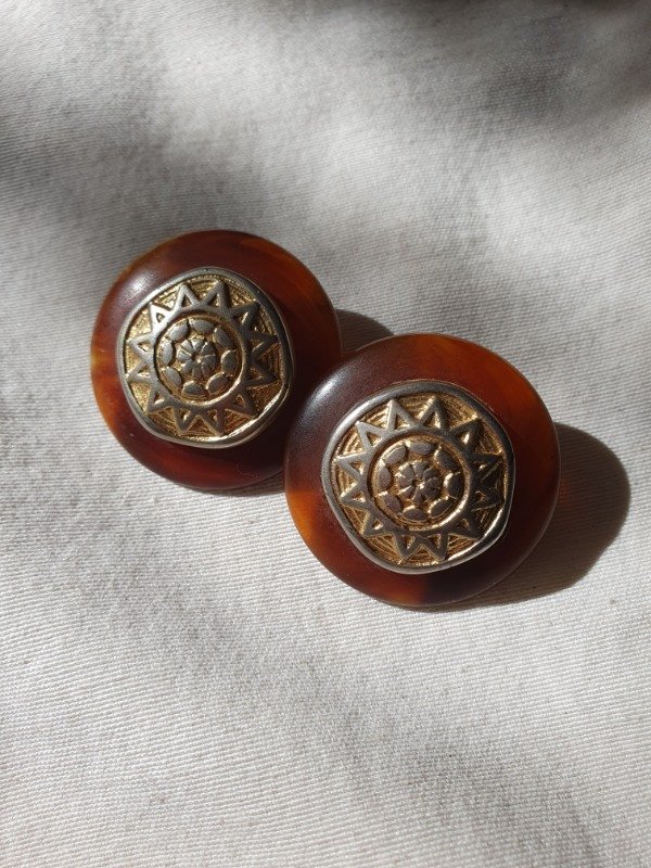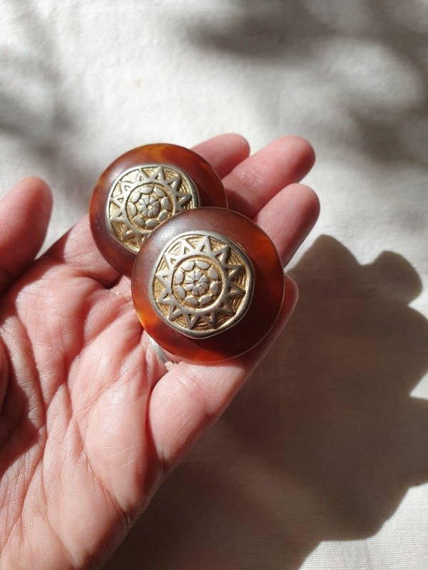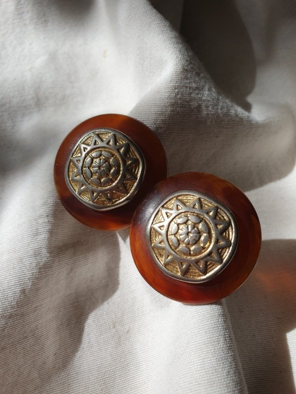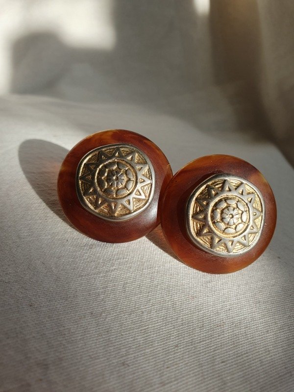 Audaces y envolventes, estos aros de clip firmados por Cecilia Bringheli capturan la esencia del diseño italiano de los años 80. Su forma circular, en resina translúcida color ámbar / carey, evoca la calidez de los materiales orgánicos. En el centro, un medallón dorado con un motivo solar en relieve aporta una impronta simbólica y sofisticada. El contraste entre texturas –la suavidad de la resina y la riqueza del metal trabajado– crea una pieza vibrante, perfecta para quienes buscan un accesorio con fuerza estética. Miden 4 cm de diámetro.