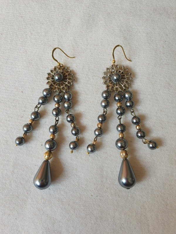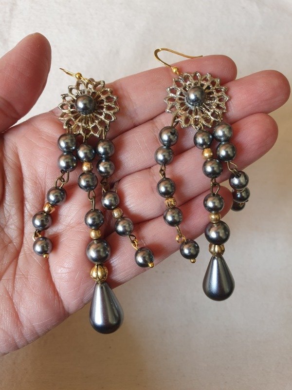 Aros Colgantes Shoulder Dusters Perlas Grises y Filigrana