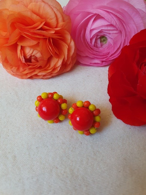 Aros pasantes perlas de opalina coral con la mitad recubierta en perlitas naranjas y amarillas