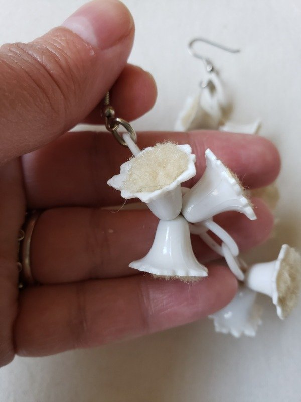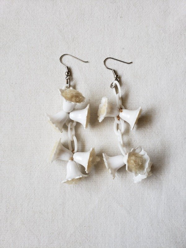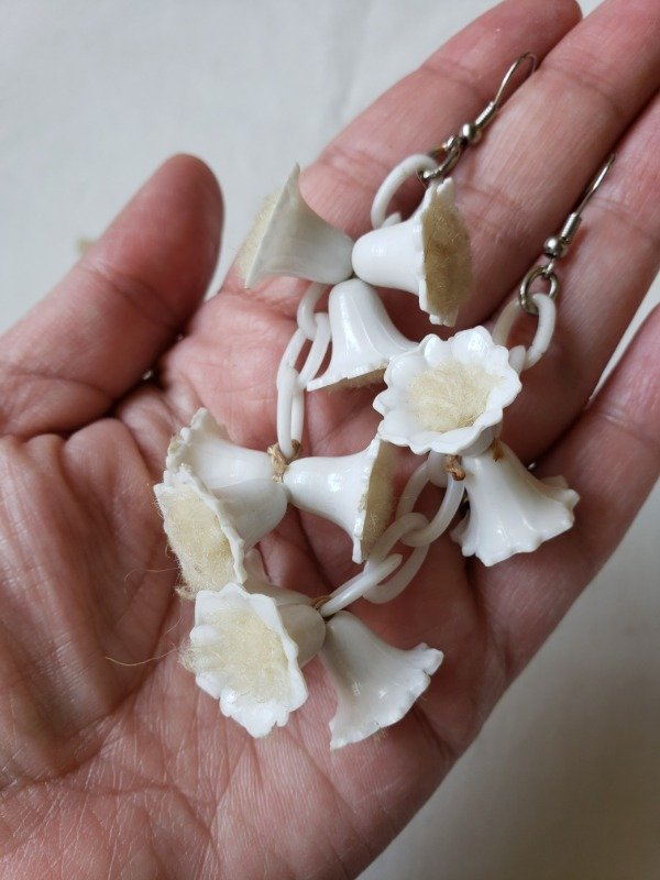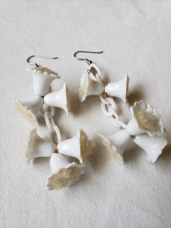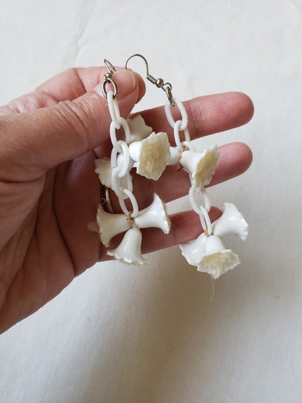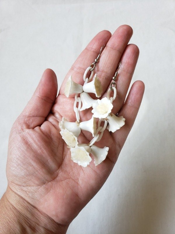 Aros colgantes de cadenas y florcitas campanitas de celuloide blanco de los años 40s. Las florcitas en su interior tienen felpita color crudo. Las bases son de los 80s, porque las originales no resistieron el paso del tiempo. Pero si ven con detenimiento cómo están anudadas las florcitas, con un hilo antiquísimo. Una belleza única y original. Miden 9 cm de longitud x 2,5 cm de ancho.