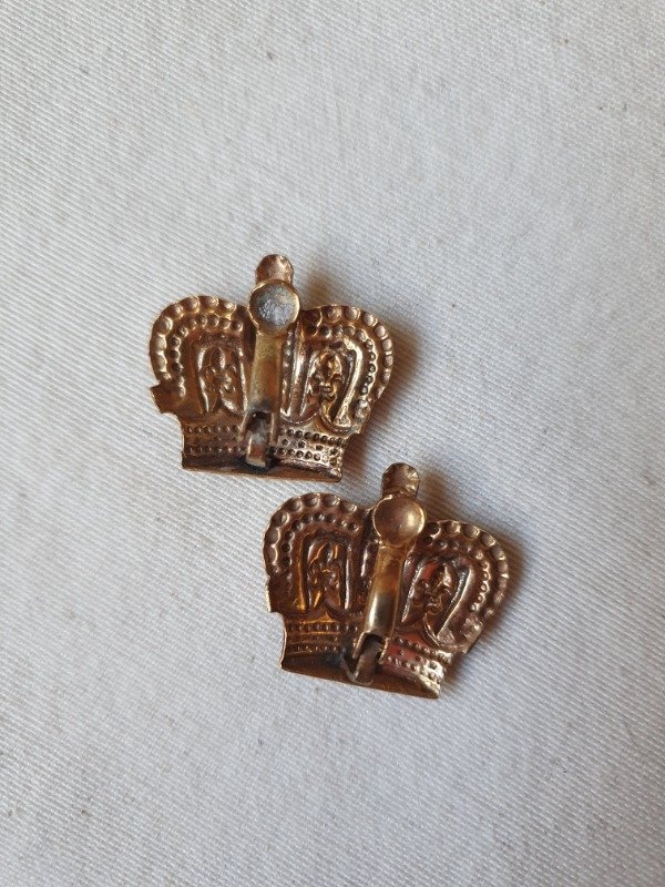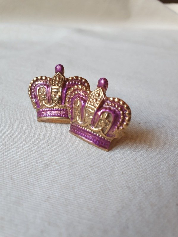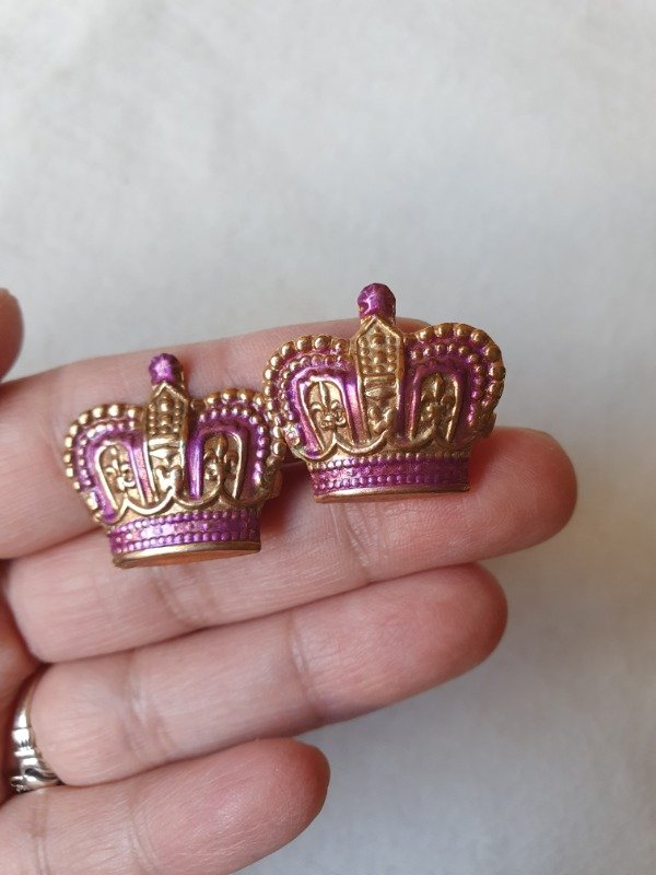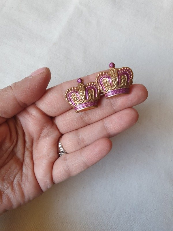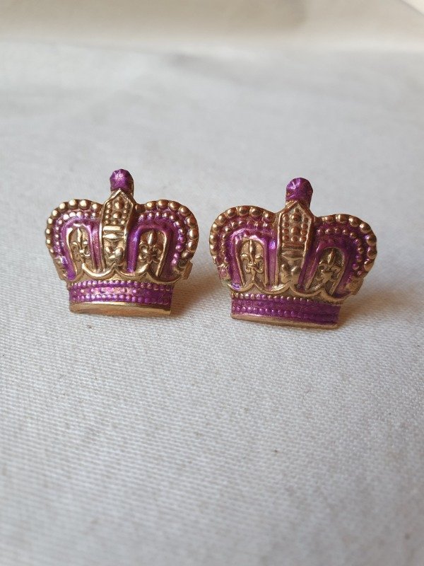 Aros clips 40s con forma de coronitas de latón dorado labrado y detalles de esmalte liláceo. Miden 2,2 cm y las patitas de los clips son ultra cómodos. Ni se sienten.