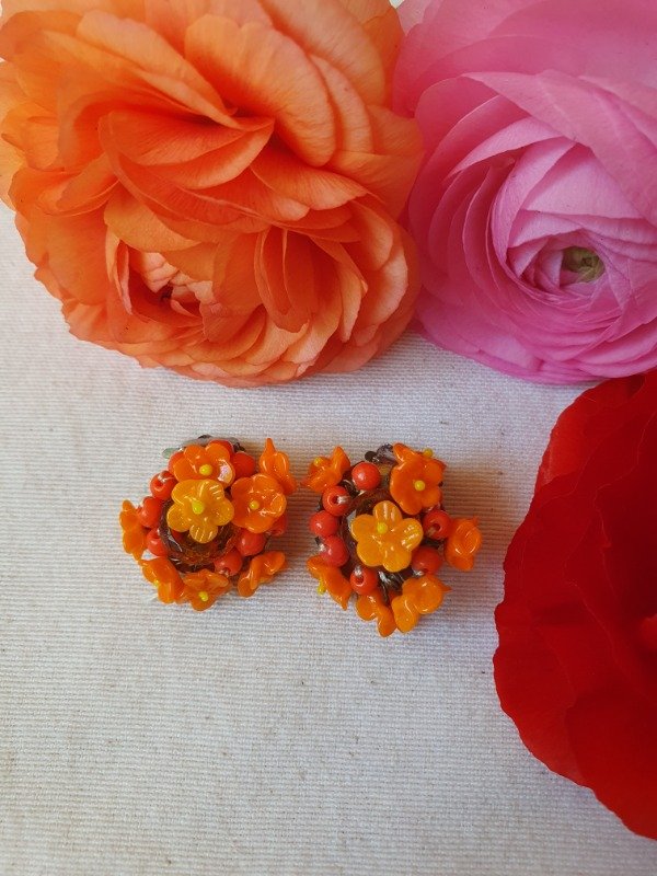 Clips 40s bouquets de florcitas de vidrio moldeado y perlitas de opalina en varios tonos de naranja