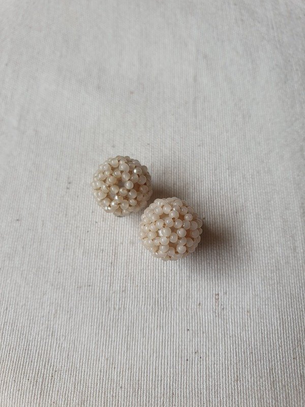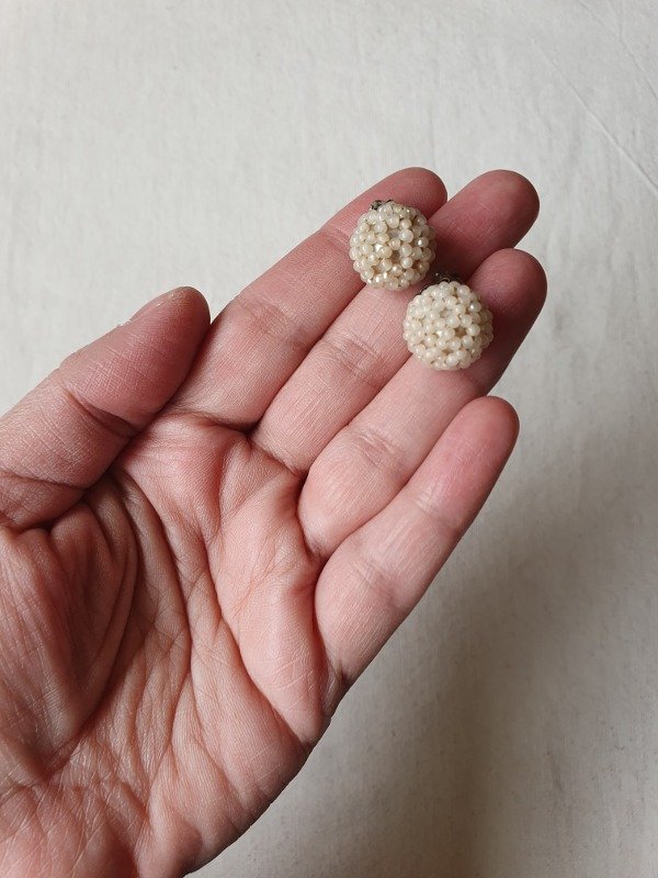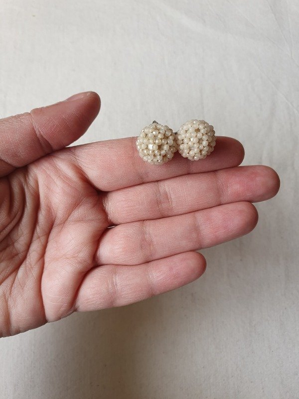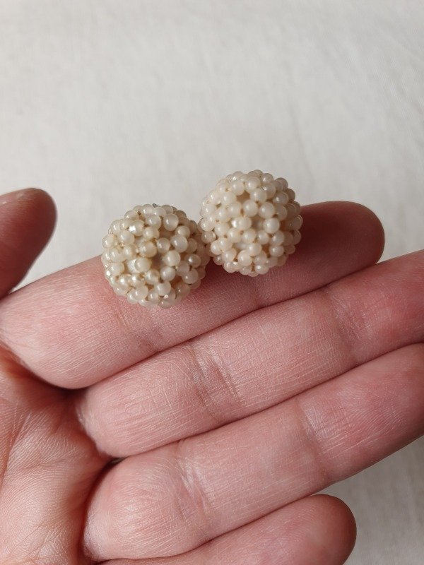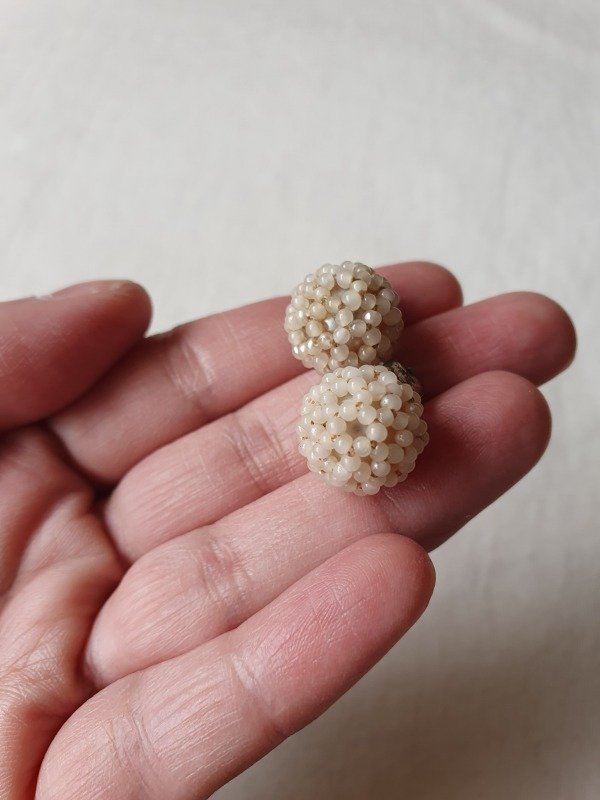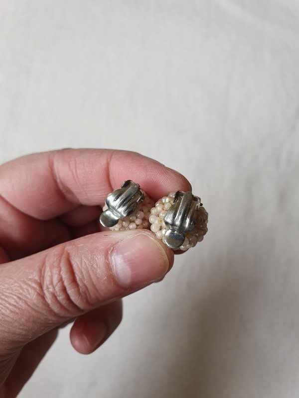 Mini clips de fines de los 30s-40s, con forma de perla recubierta íntegramente en microperlitas con un motivo de florcitas.