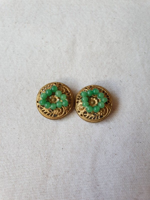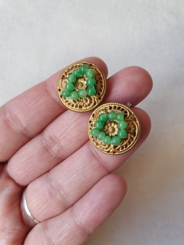 Miniclips 30s-40s dorados con labrado y microperlitas de cristal verde
