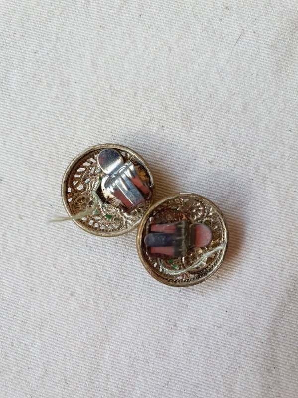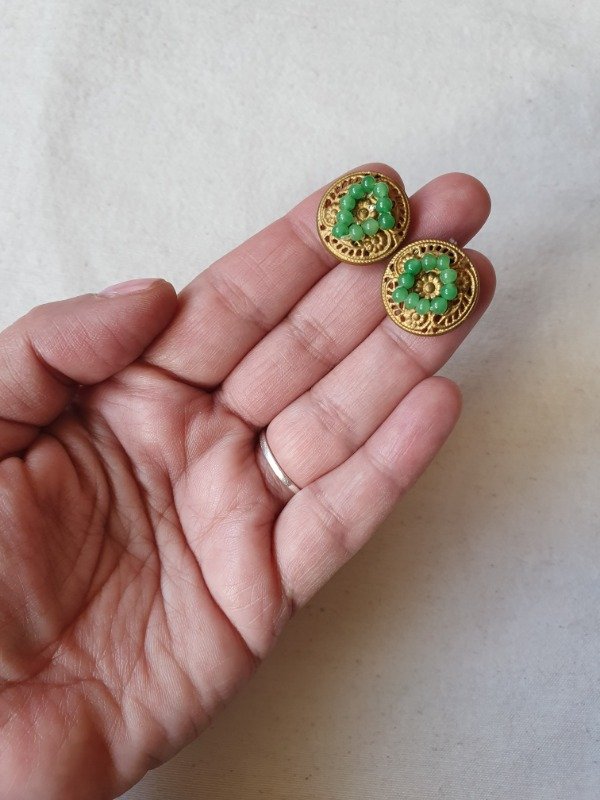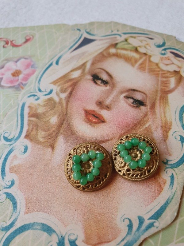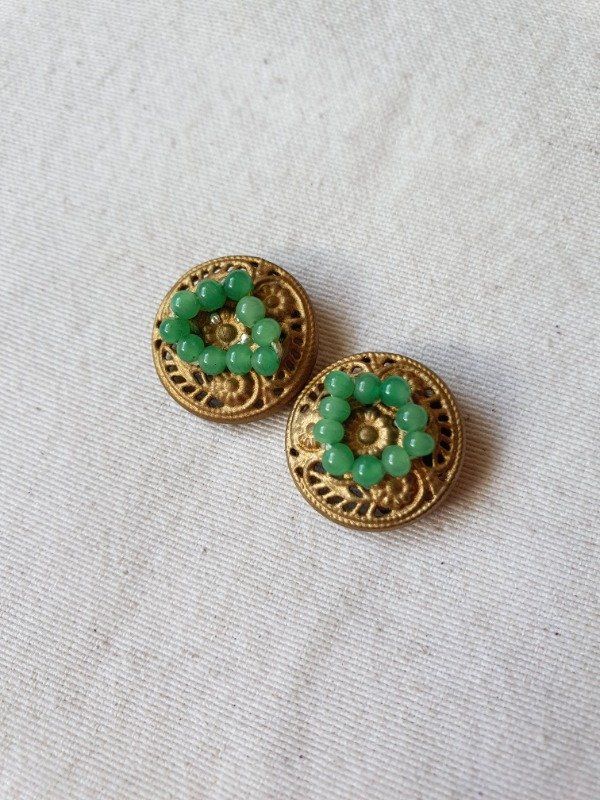 Miniclips 30s-40s dorados con labrado y microperlitas de cristal verde