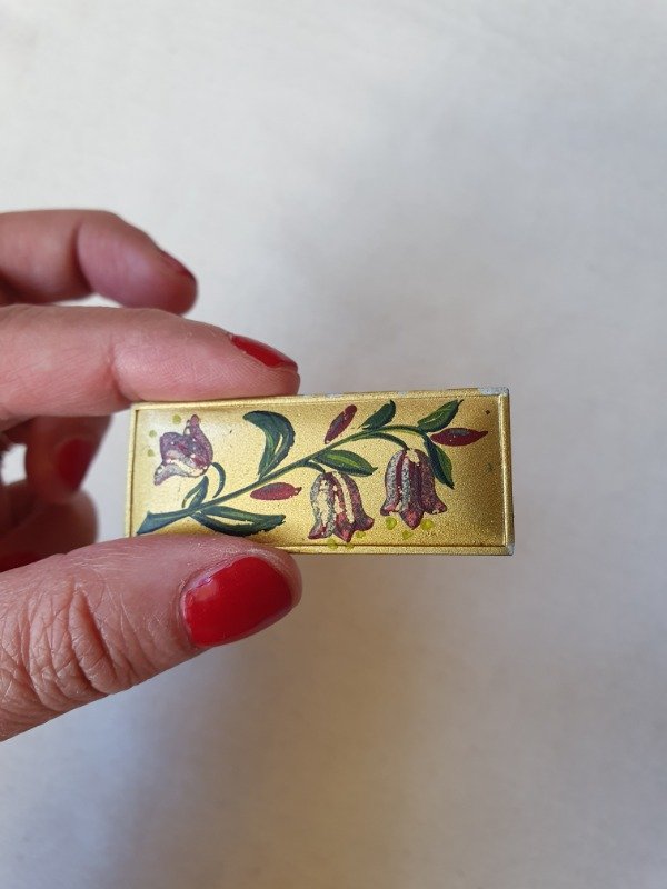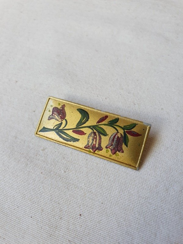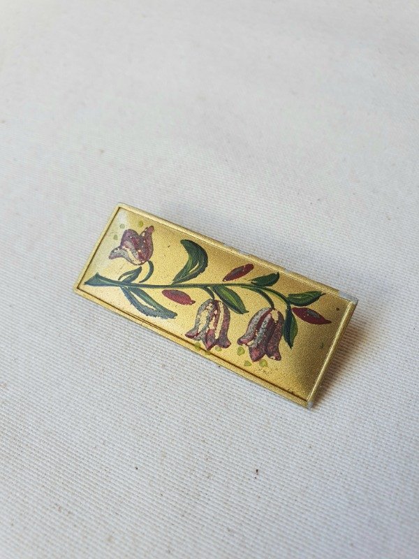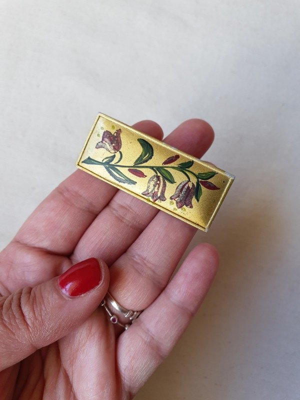 Barrette antigua alemana, rectangular y con flores rojas, siemprevivas de los Alpes, pintadas a mano. La base rectangular es de metal dorado satinado y la guarda de flores, exquisita. Mide 5 cm de longitud