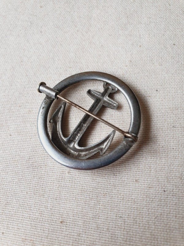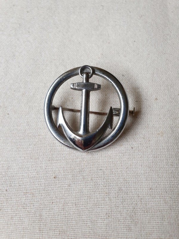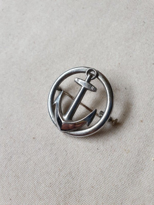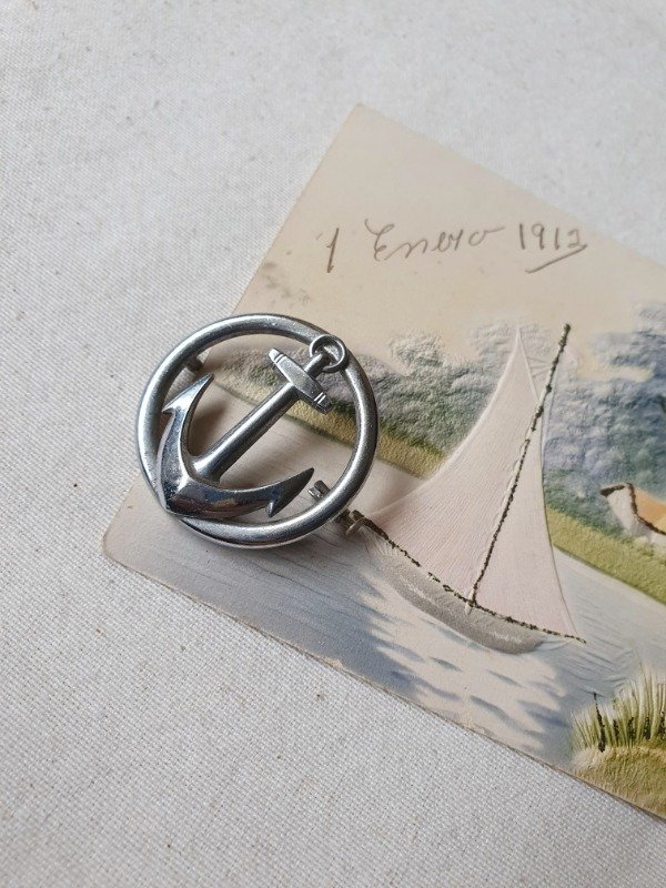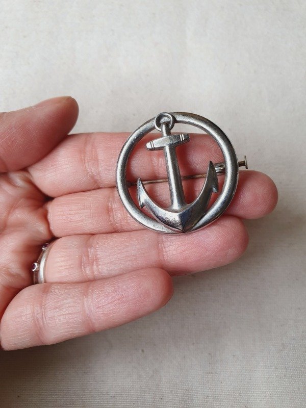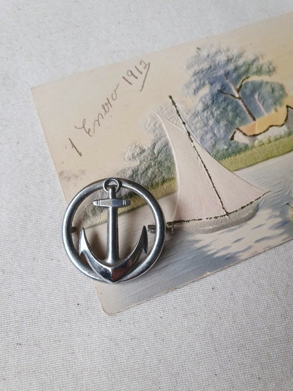 Broche ancla de los 40s, con marco circular, en metal plateado brillante. Mide 3,5 cm de diámetro y tiene cierre tambor francés.