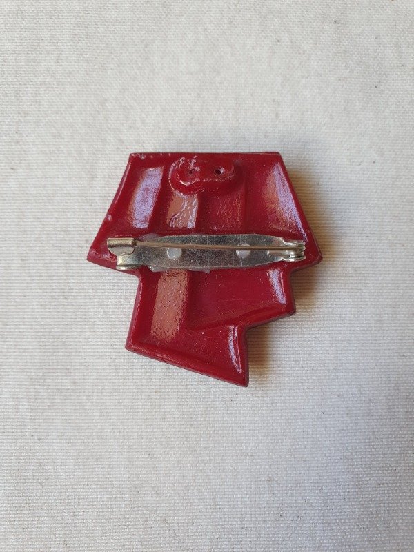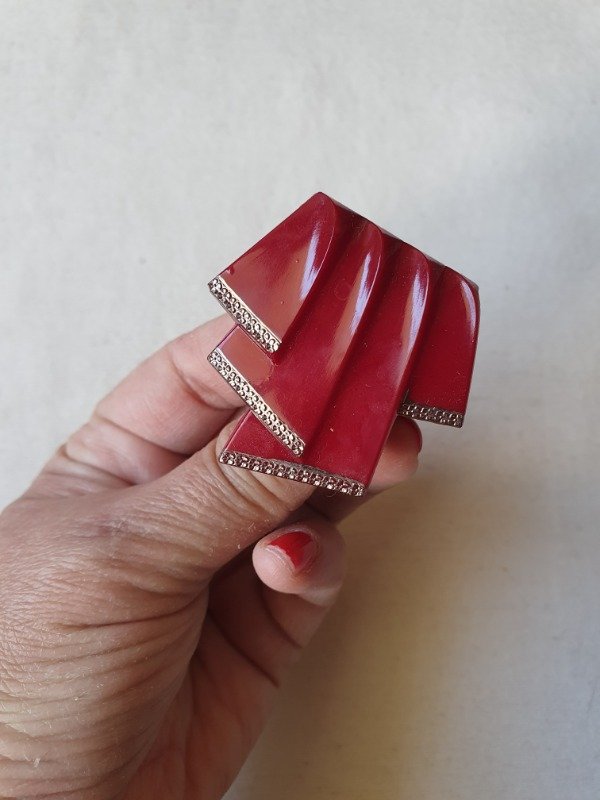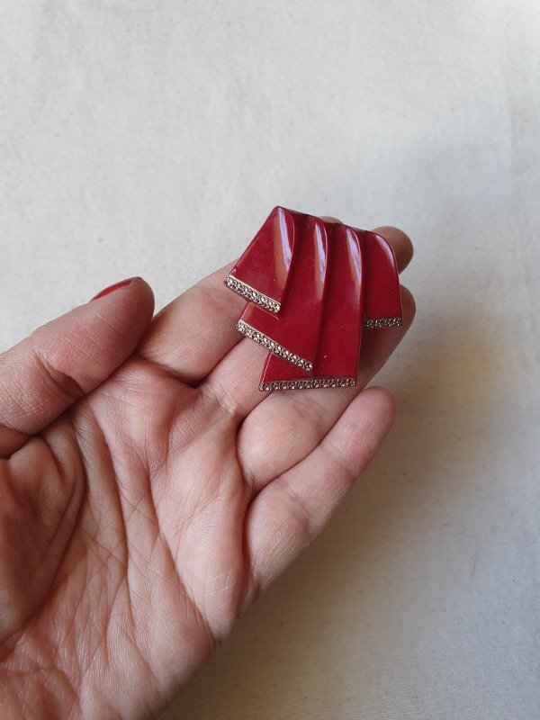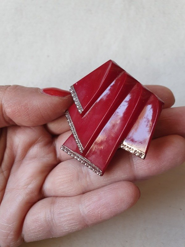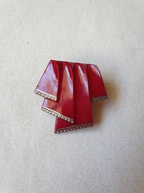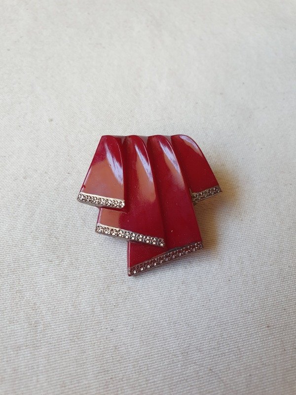 Broche Art Deco de cristal moldeado en tono granate, geométrico, con pliegues que en sus bordes tienen detalles plateados. Mide 5 cm x 4 cm