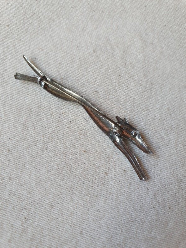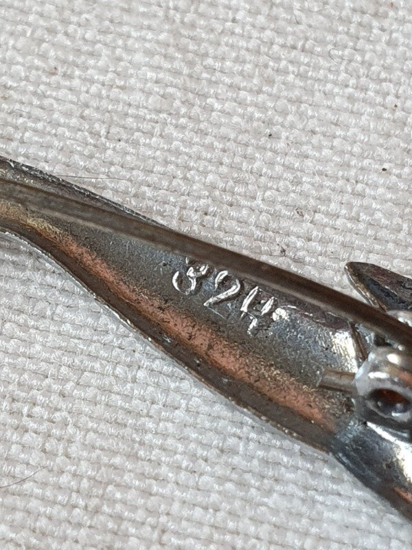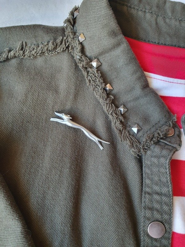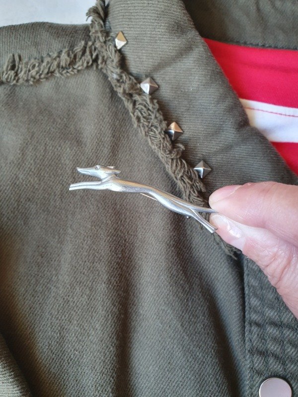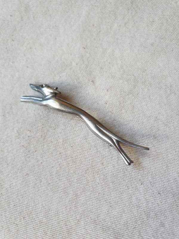 Brochecito Art Déco de los años 40s, de metal plateado y con forma de galgo ultra estilizado y finito. Mide 6 cm de longitud x 1 cm y tiene cierre tipo C. Sellado “324” (número de factoría checa de la época post II Guerr4 Mundial) en el dorso