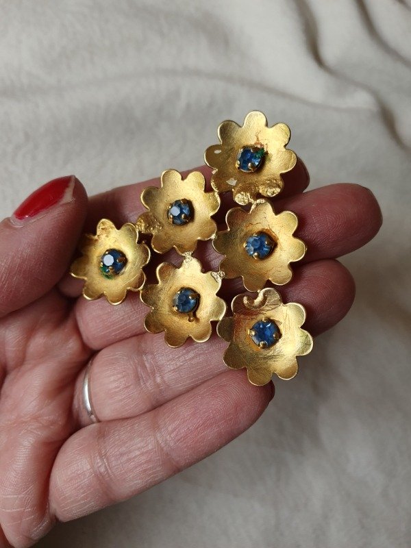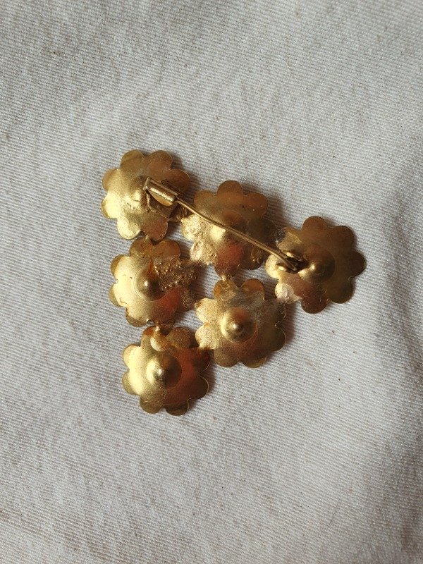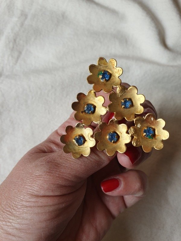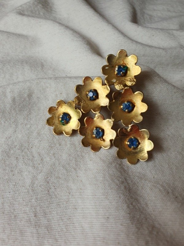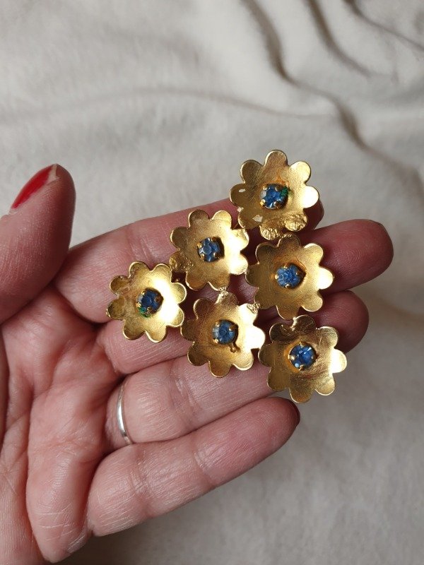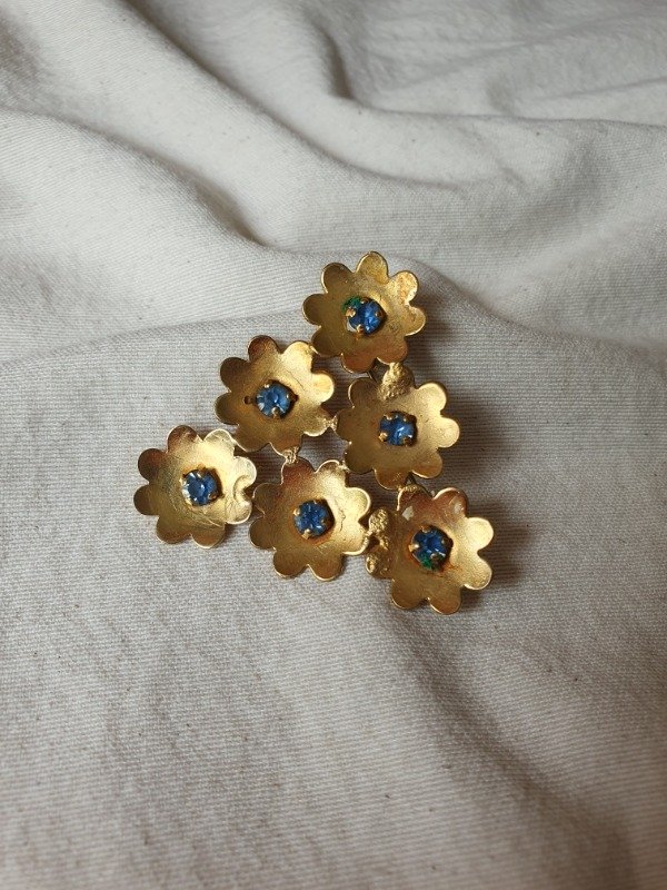 Broche de los 40s, de material tipo oro fix dorado. El diseño es triangular formado por margaritas doradas con centro de cristales celestes engarzados. Mide 5 cm de lado. El cierre es tipo C de la época