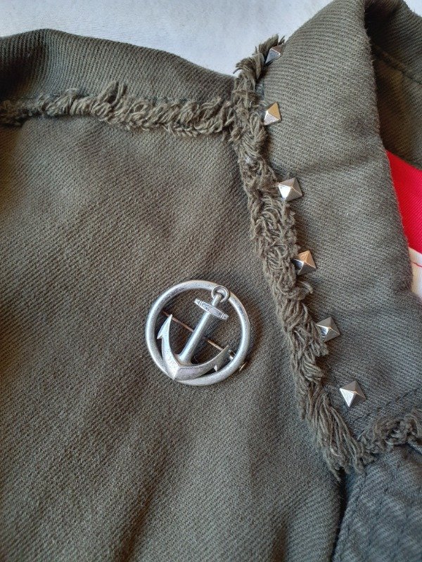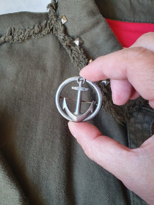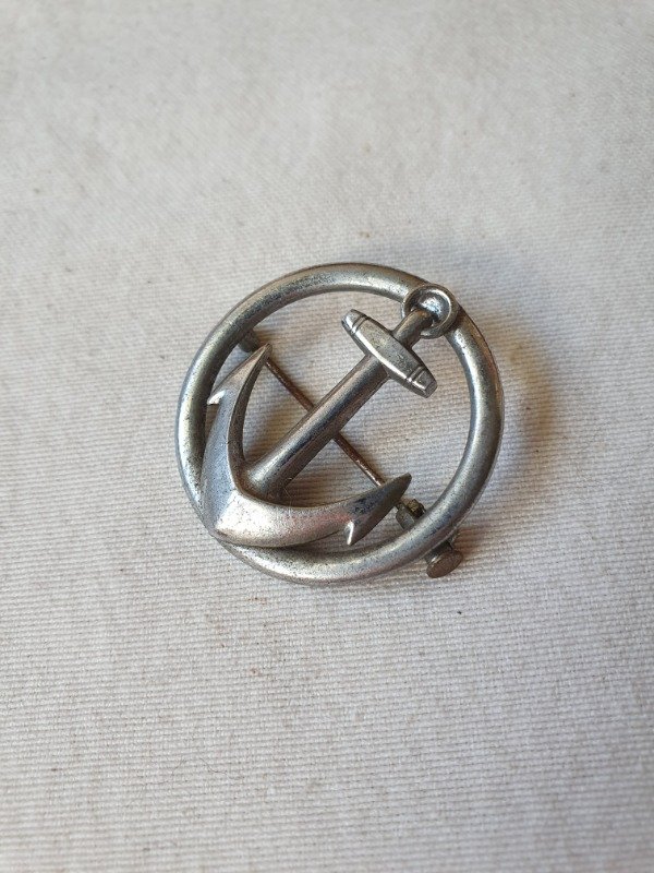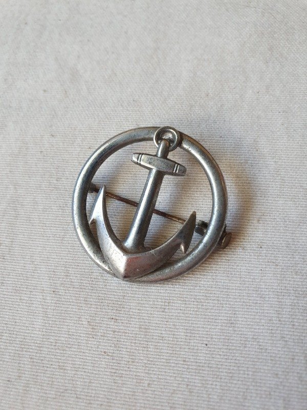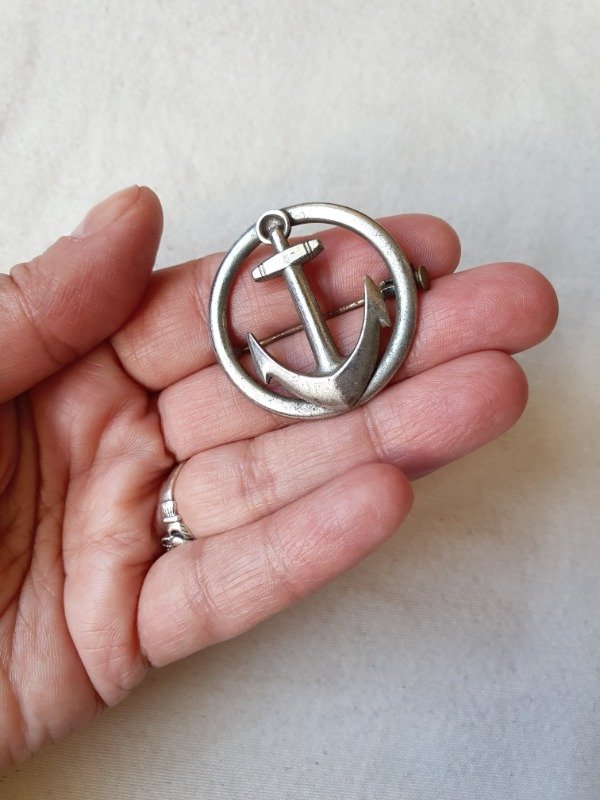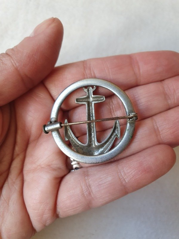 Broche ancla de los 40s, con marco circular, en metal plateado brillante. Mide 3,5 cm de diámetro y tiene cierre tambor francés.