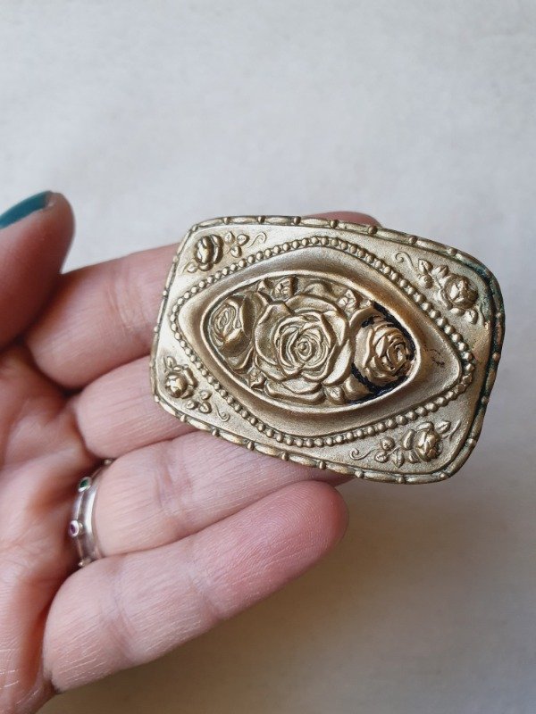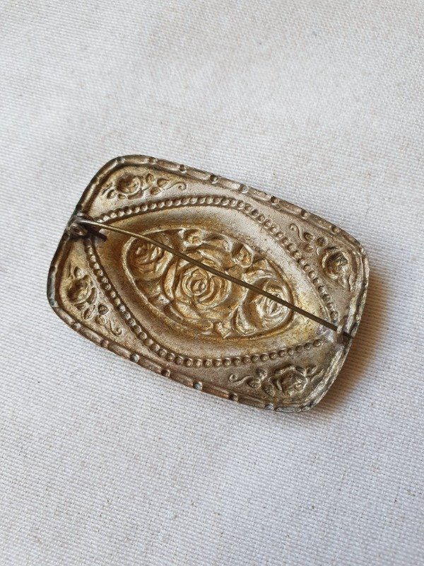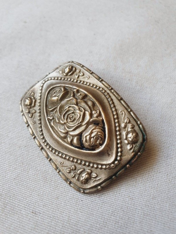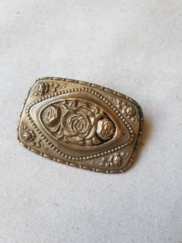 Broche eduardiano, plaqueta floral con motivo de rosas. Muy antiguo, de principios de siglo pasado de latón labrado en tono peltre, muy liviano. Mide 5 cm x 3,4 cm