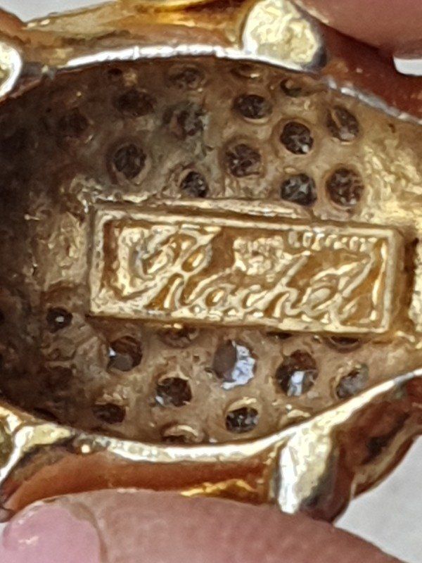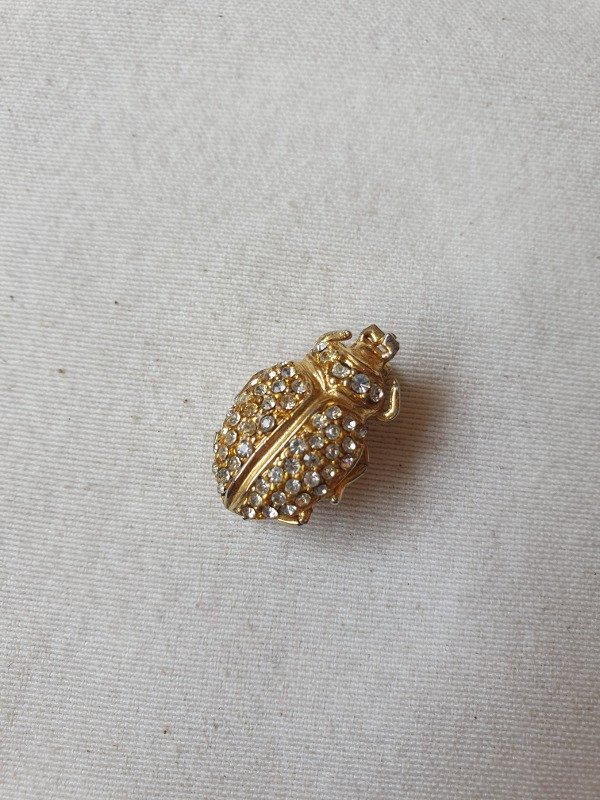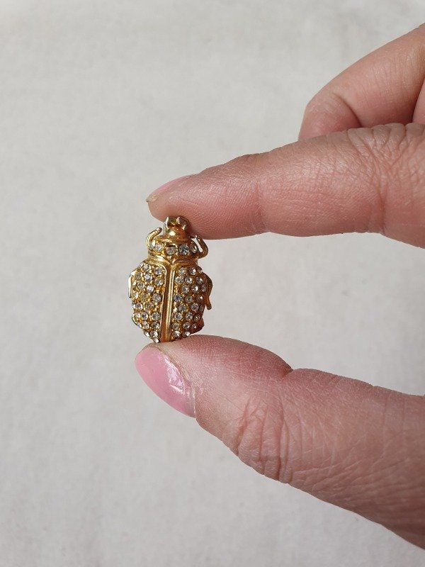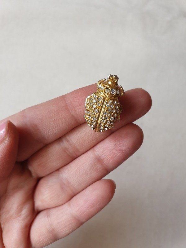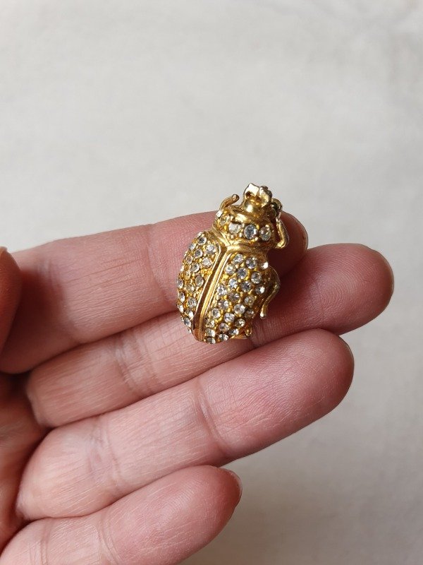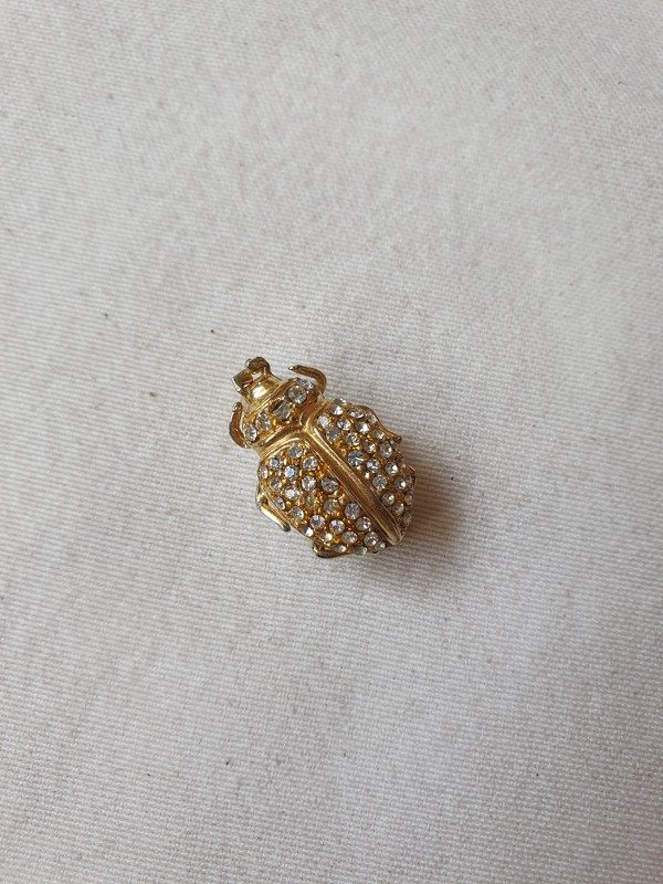 Broche escarabajo de los 90s, de la boutique norteamericana Rachel. Es de metal dorado cubierto íntegramente con pequeños strass en engarce pavé. Divino y mágico. Mide 2,5 cm