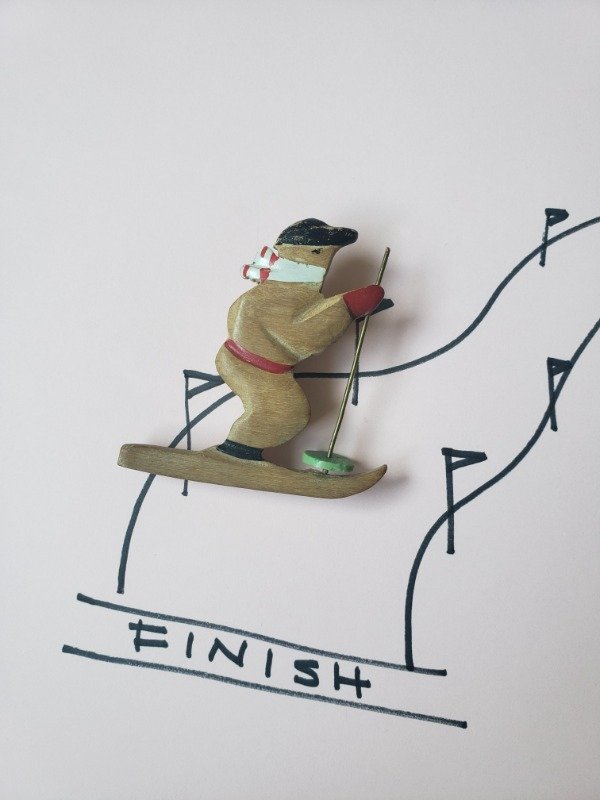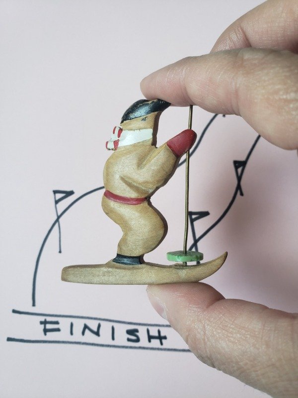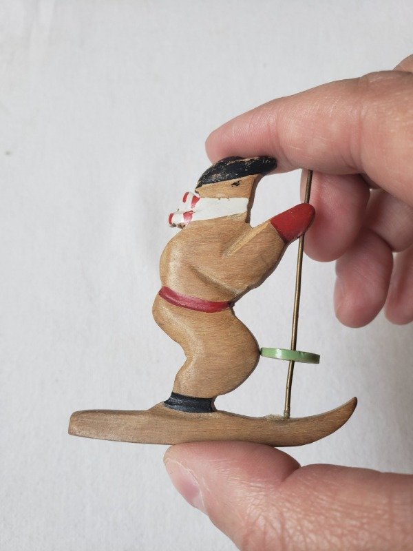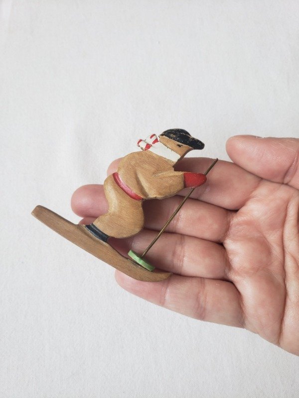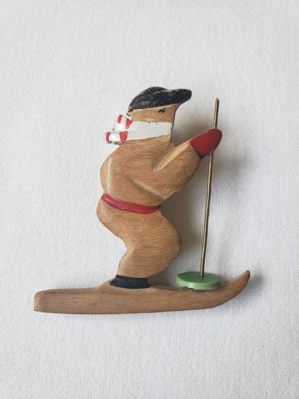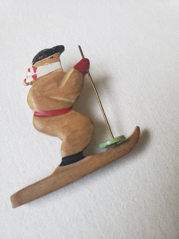 Broche de madera tallada con esquiadorx de perfil y bastón de metal con círculo verde móvil. Simpatiquísima su silueta e indumentaria. Mide 6 cm x 5,5 cm
