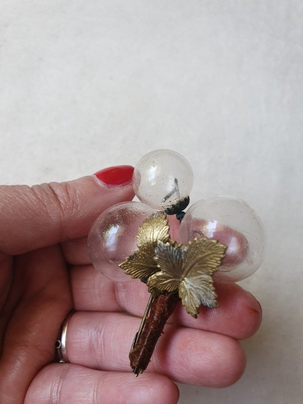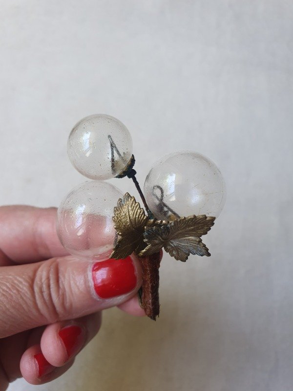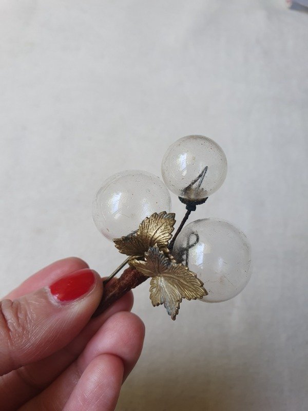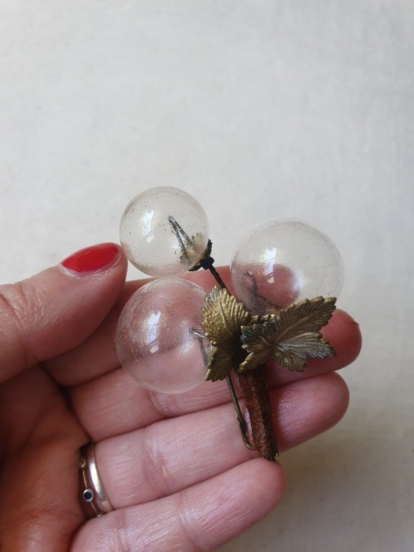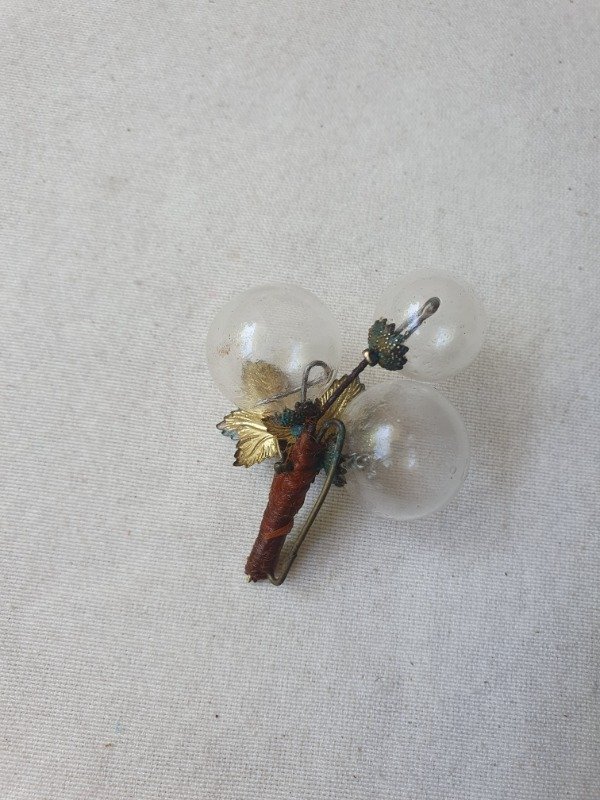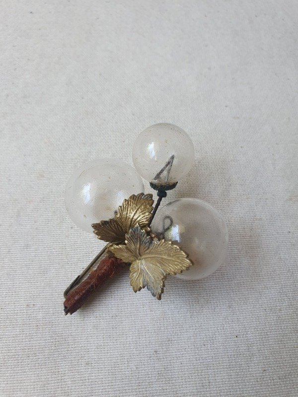 Prendedor racimo con tres burbujas de cristal soplado (hueco) incoloro con dos hojitas doradas de metal dorado. Las burbujas están engarzadas a “tallos” de alambre que, a su vez, están atados al broche con vueltas de hilo de seda. Mide 5,5 cm x 4,5 cm