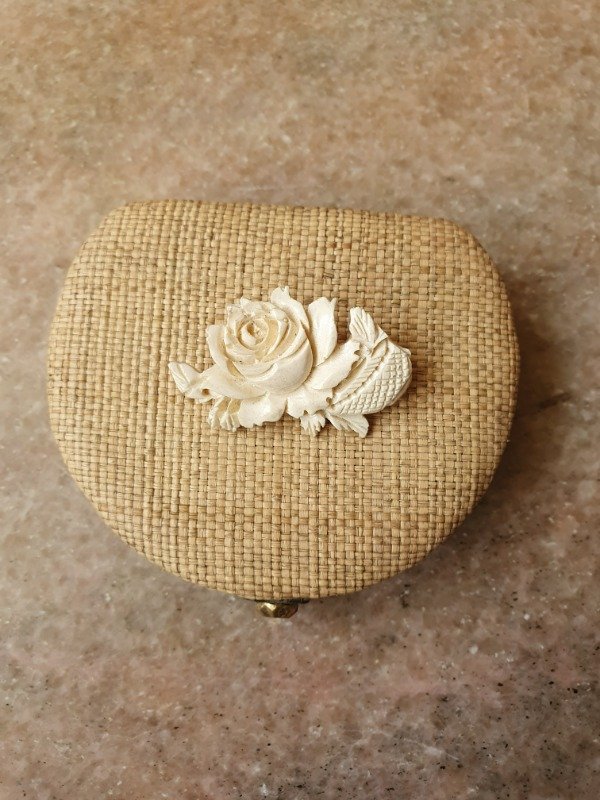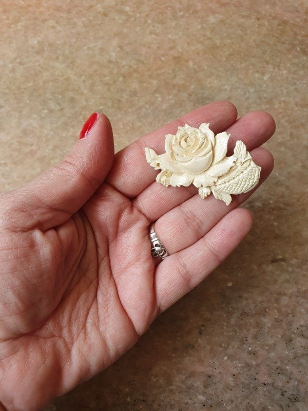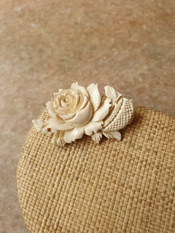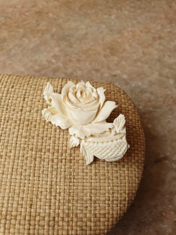 Broche de celuloide color marfil con forma de rosa tallada en canastita
