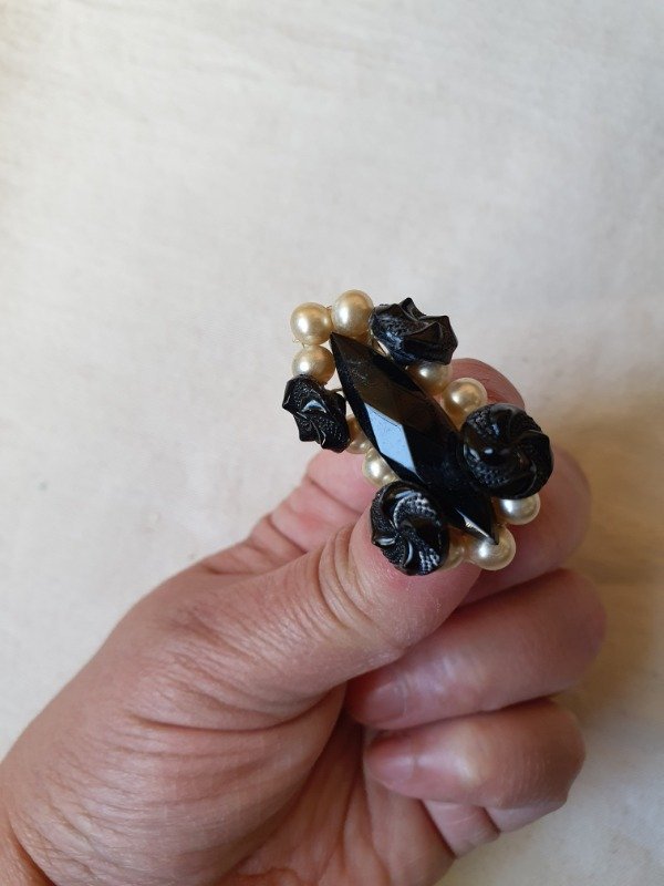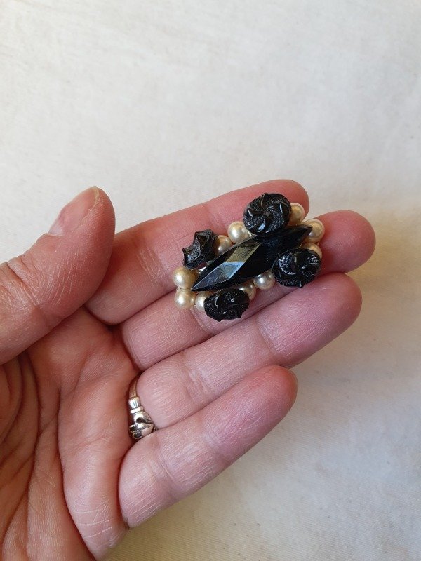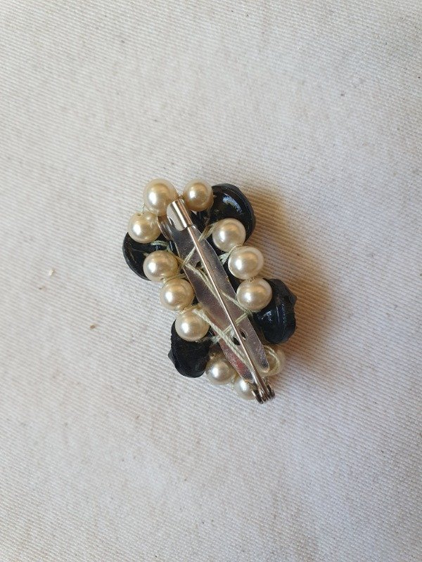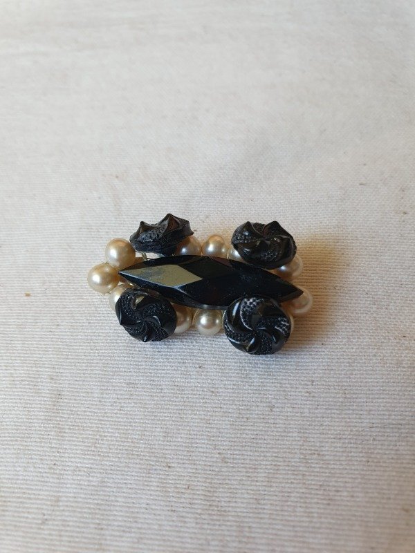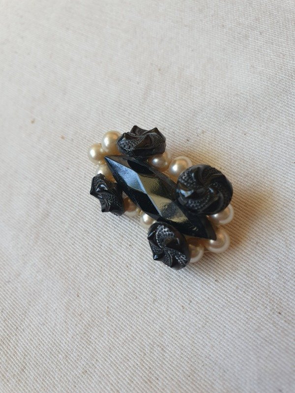 Broche 40s de cristales negros geométricos facetados, bordeados por perlas blancas. Mide 4 cm