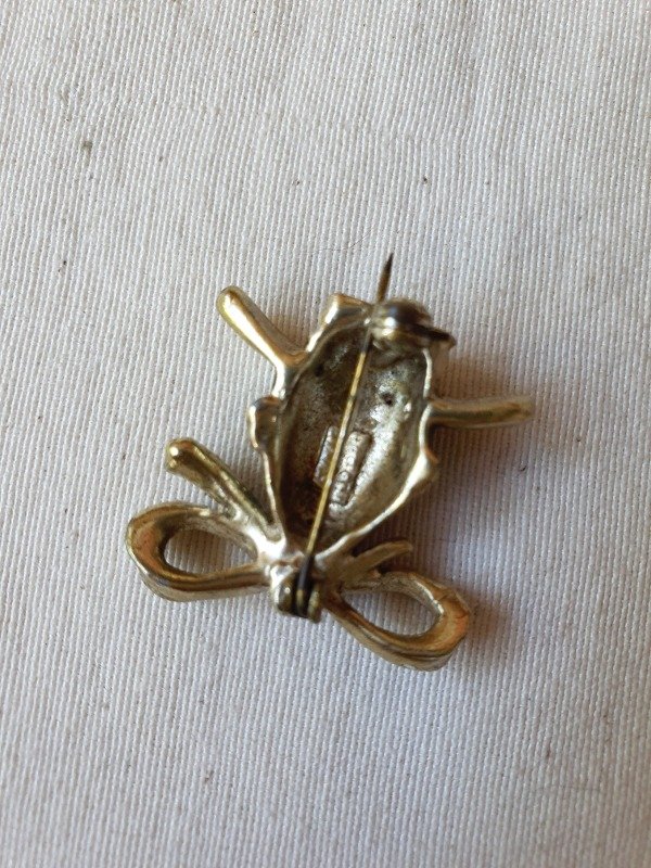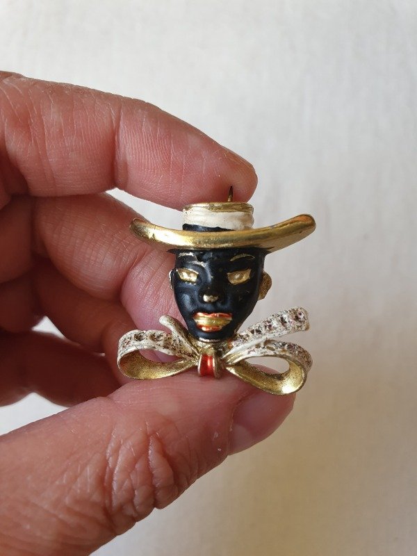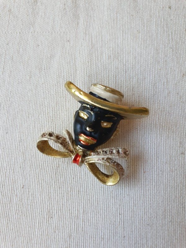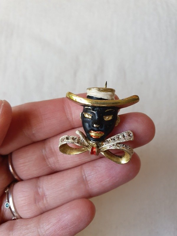 Brochecito de los 40s, marca King, industria nacional (una firma que diseñó la bijou argentina más bella de los 40s), con un motivo súper divertido, de una máscara con su sombrero de toquilla, detalles metalizados en rojo y moño. Mide 3 cm x 2,5 cm