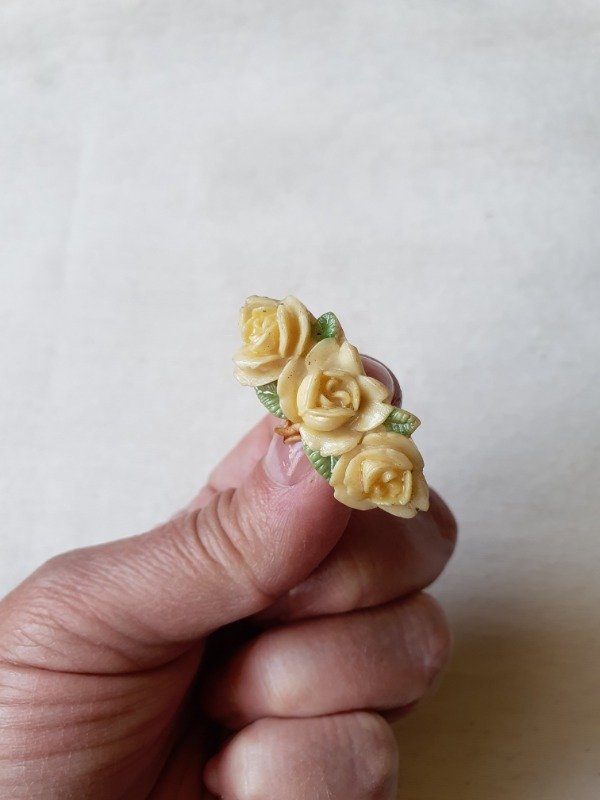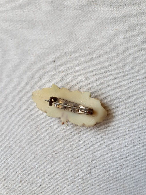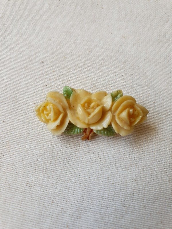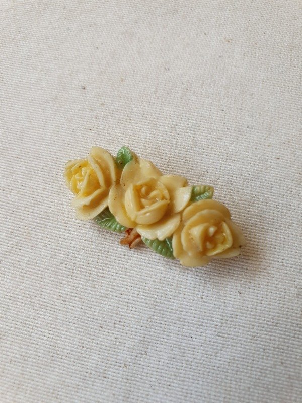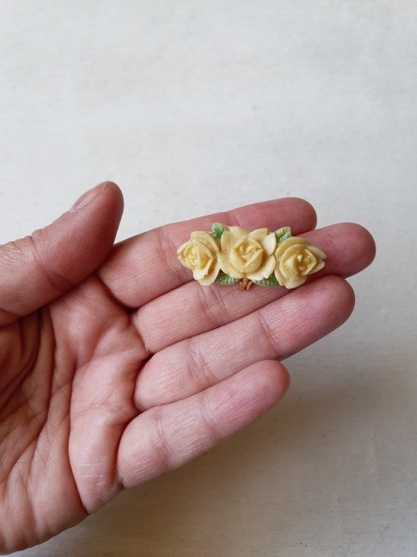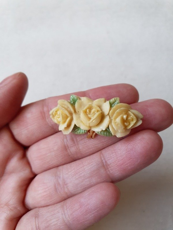 Brochecito japonés de los años 30s, de tres rositas realizado en celuloide moldeado y coloreado en tonos amarillitos y verdes. Es una belleza romántica y delicada, con un nivel de detalle minúsculo increíble. Mide 4 cm de ancho.