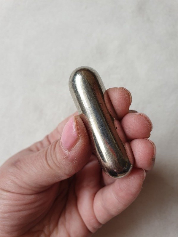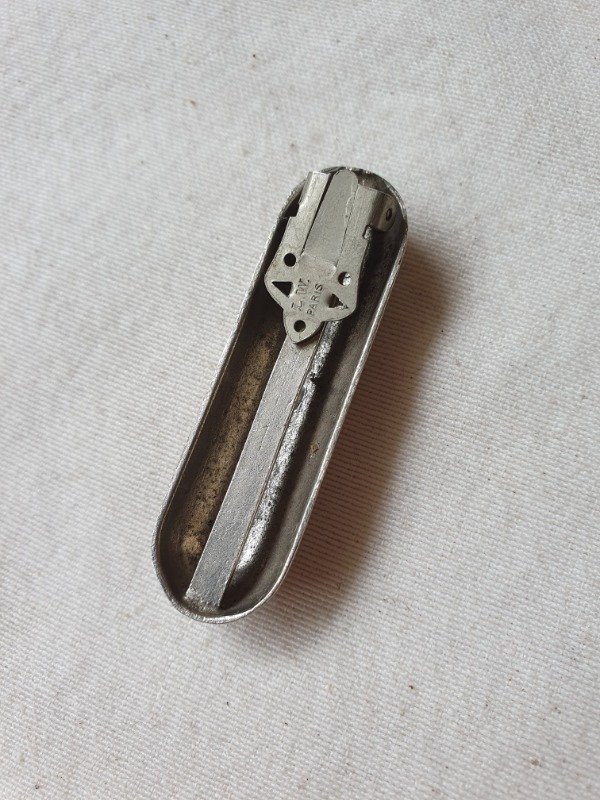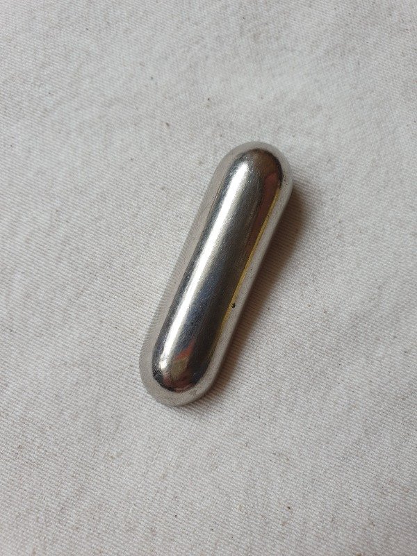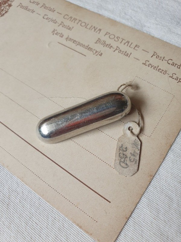 Clip de vestido años 30s. Bullet de metal plateado, alargada y con bordes redondeados. Mide 4 cm x 1 cm.