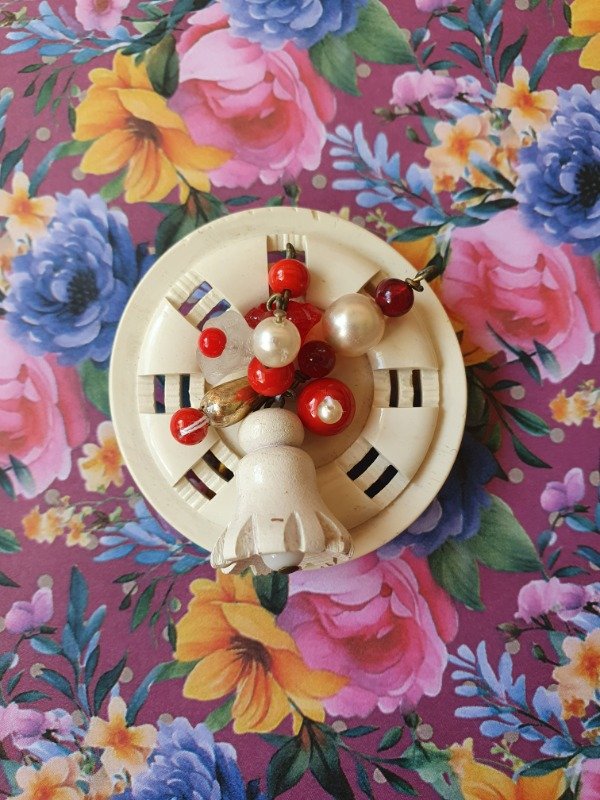 Clip de vestido de los años 30s con base circular, calada, con pétalos tallados o lisa de galalita, un material previo al plástico moderno, muy utilizado en su momento para hacer botones por su similitud con el m4rfil. La fórmula, a base de caseína y formol, se creó en el año 1903. Fue uno de los primeros plásticos orgánicos. Todo un tesoro encontrar este tipo de piezas.
