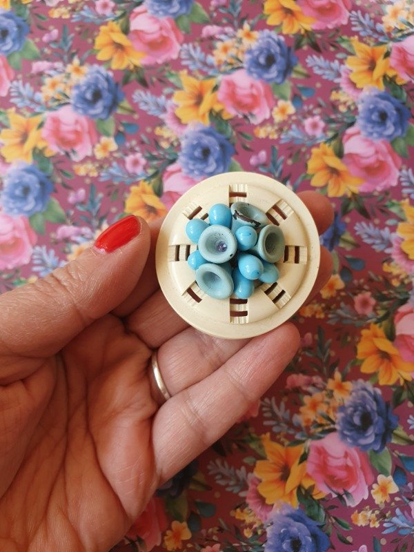 Clip de vestido de los años 30s con base circular, calada, con pétalos tallados o lisa de galalita, un material previo al plástico moderno, muy utilizado en su momento para hacer botones por su similitud con el m4rfil. La fórmula, a base de caseína y formol, se creó en el año 1903. Fue uno de los primeros plásticos orgánicos. Todo un tesoro encontrar este tipo de piezas.