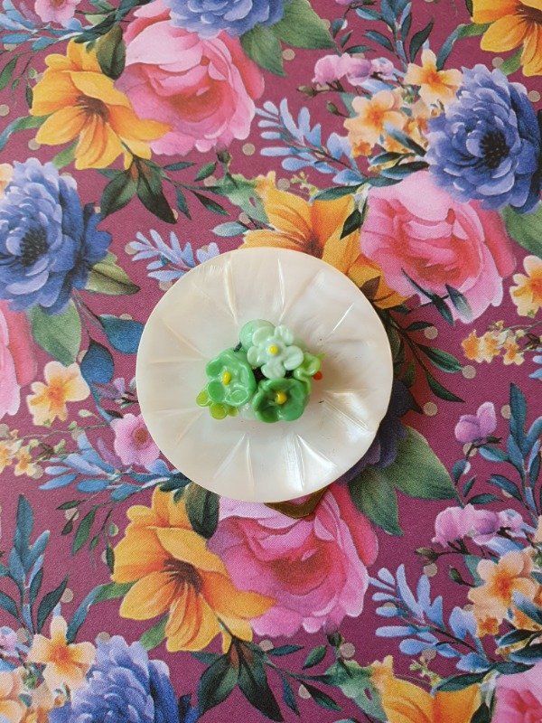 Clip de vestido de los años 30s con base circular, con pétalos o formas geométricas talladas de nácar. Todo un tesoro encontrar este tipo de piezas.