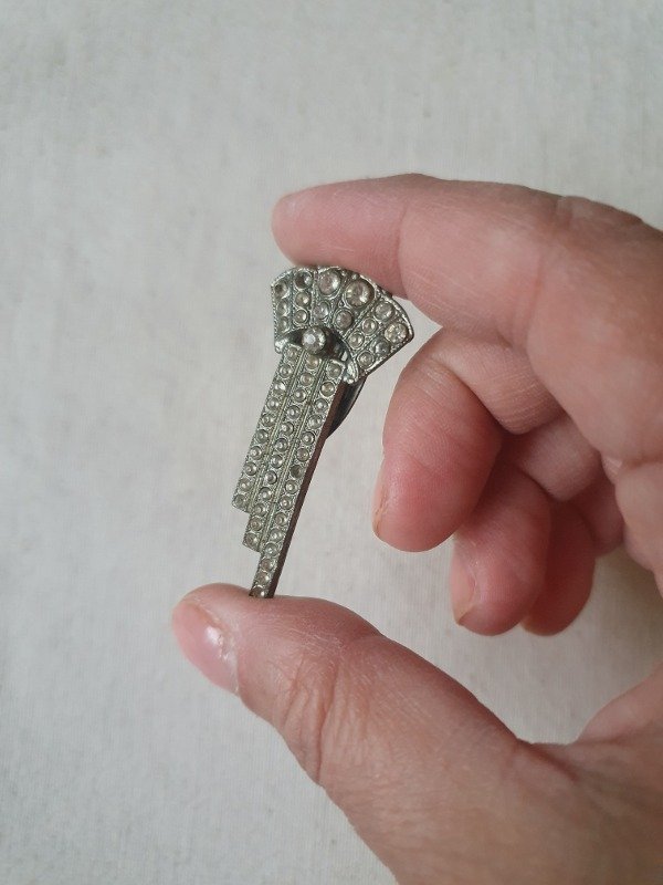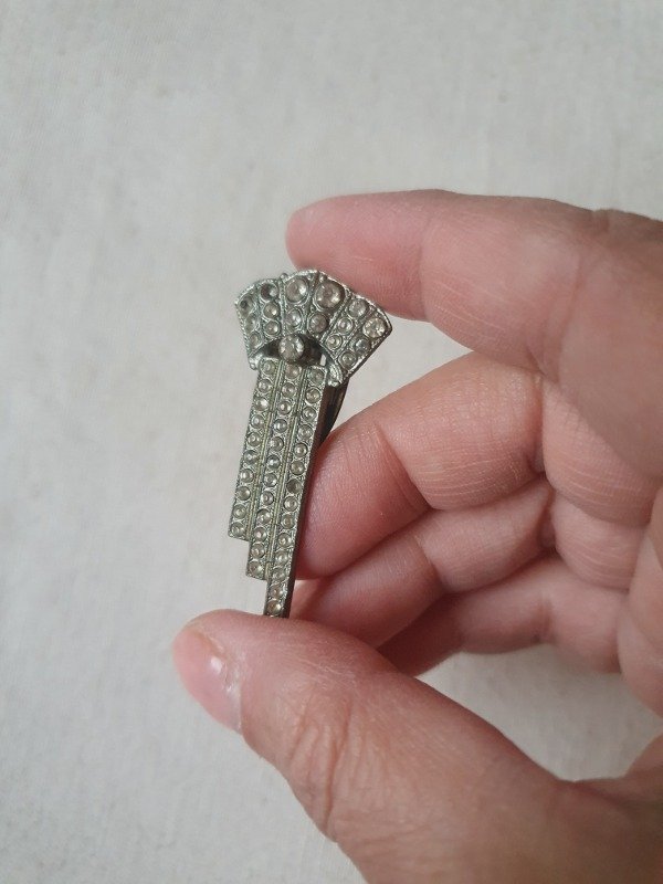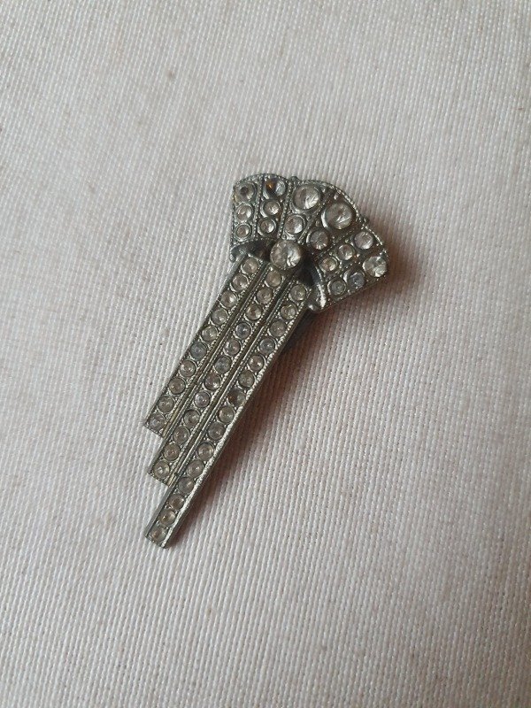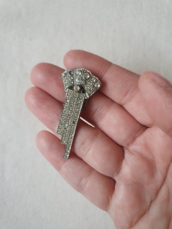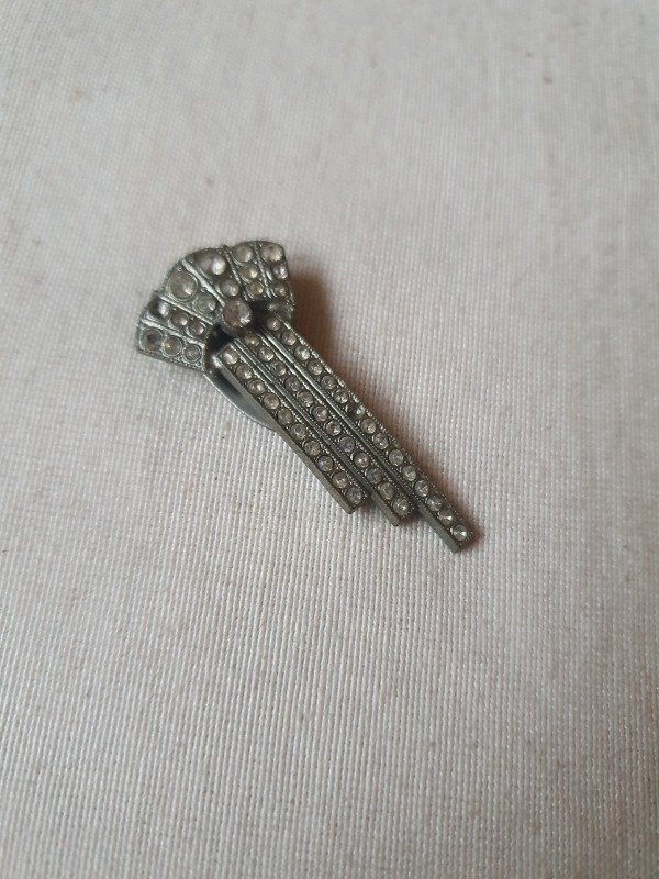 Clip de vestido años 20s-30s, con diseño tipico de la era Art Déco, está realizado con metal plateado de aleación.