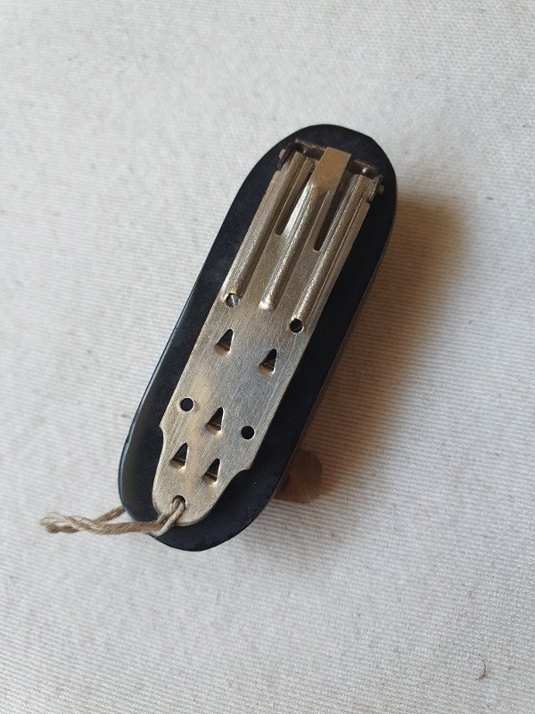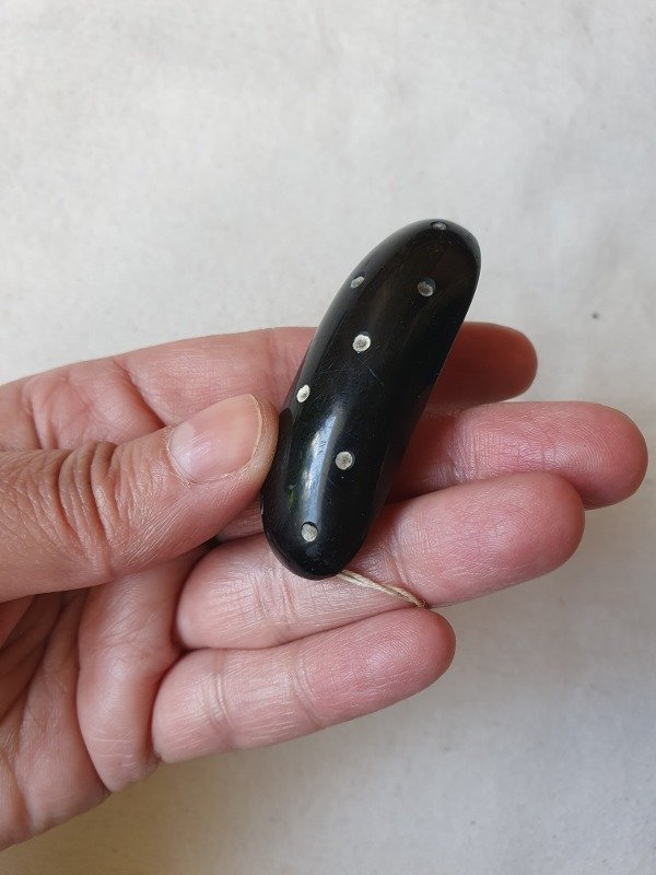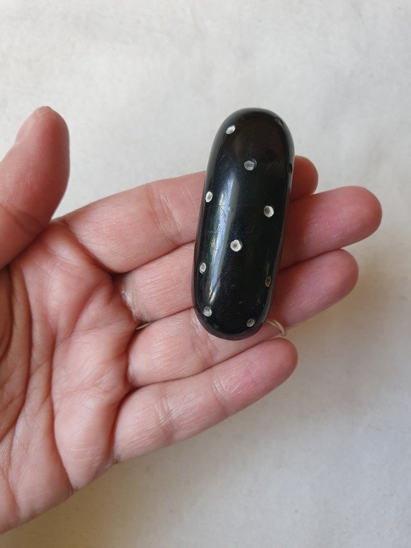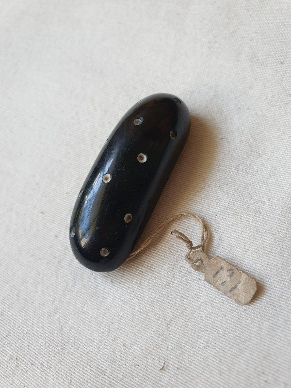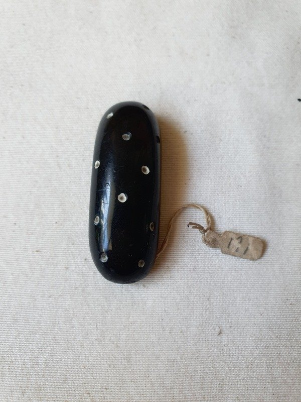 Clip de vestido Art Déco años 20s-30s de baquelita negra con forma ovalada con pequeñas motas talladas