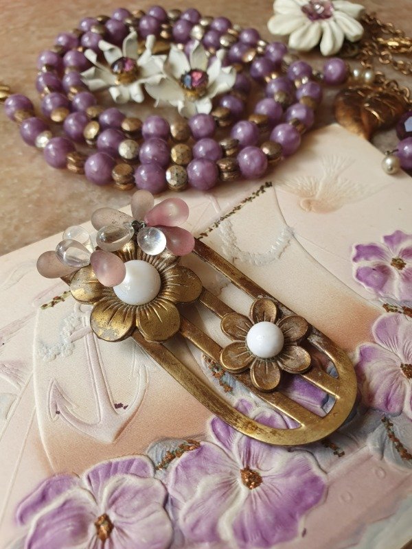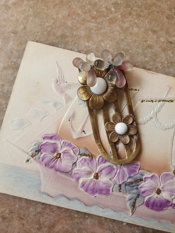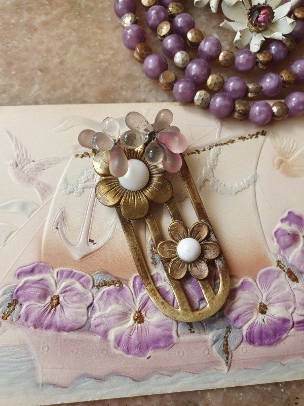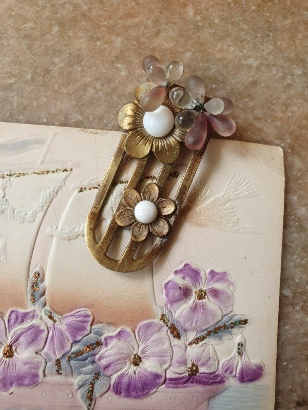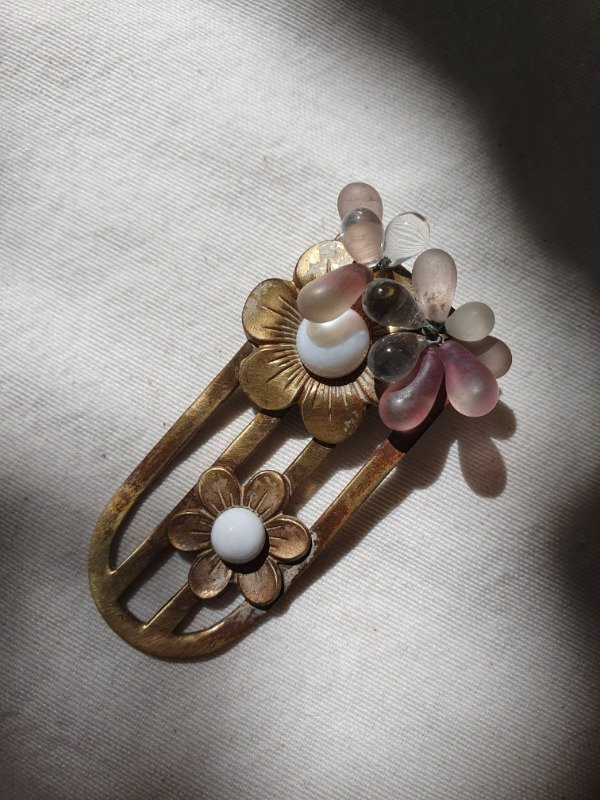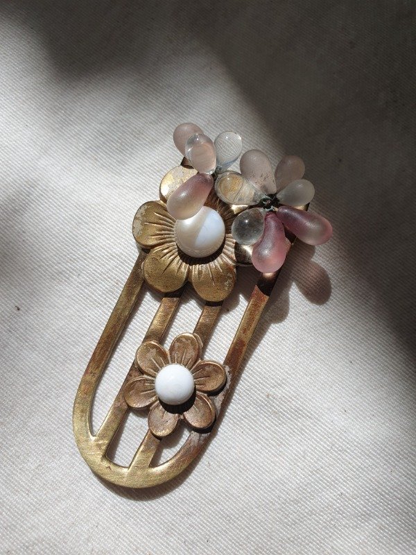 Clip de vestido Art Déco de bronce con forma geométrica, flores y gotitas cristal alilado pálido
