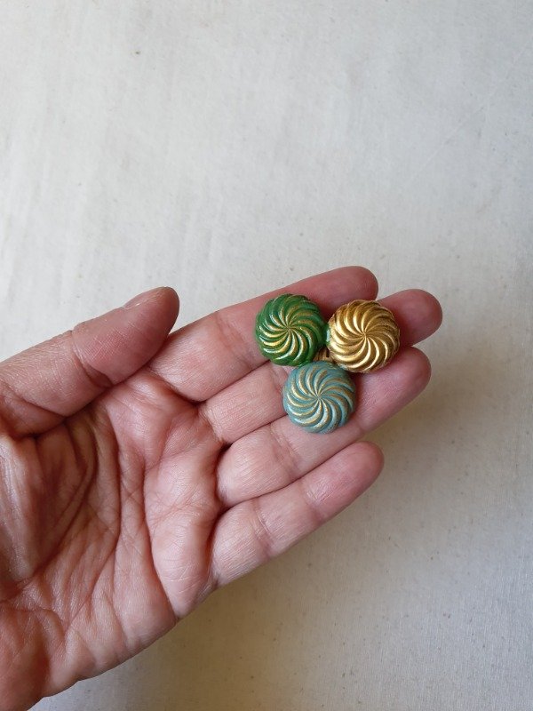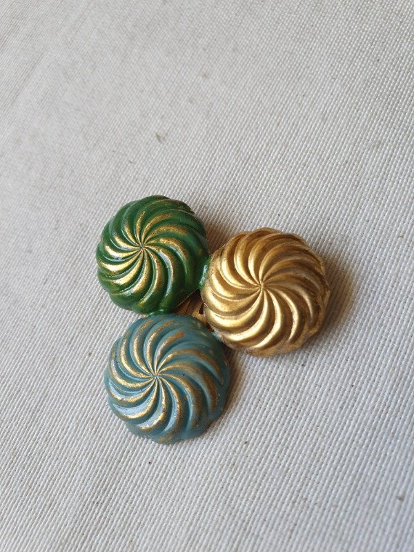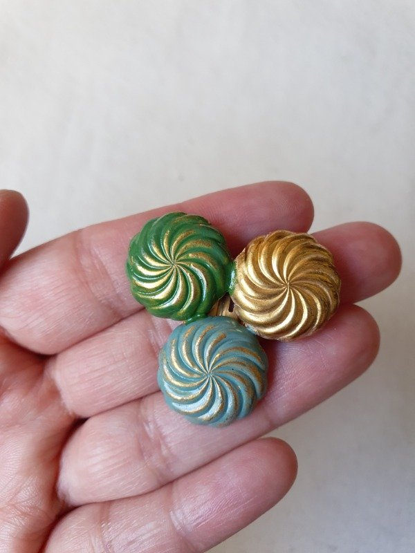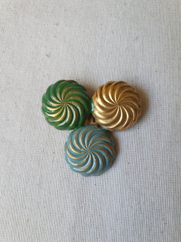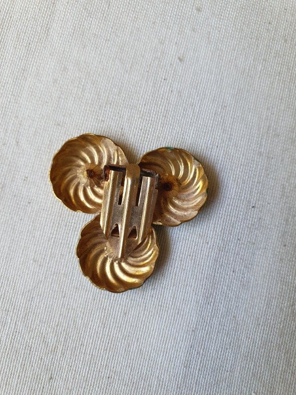Clip de vestido de los 30s con forma de tres círculos en espiral, esmaltados en azulado, verde y uno dorado. Mide 3,5 cm