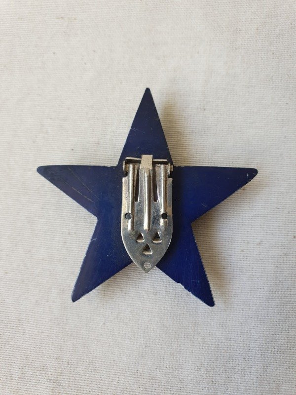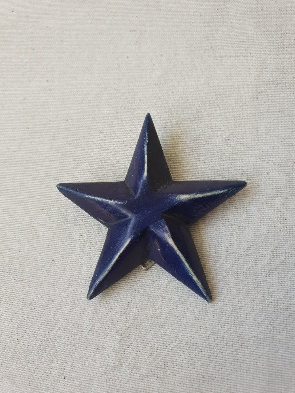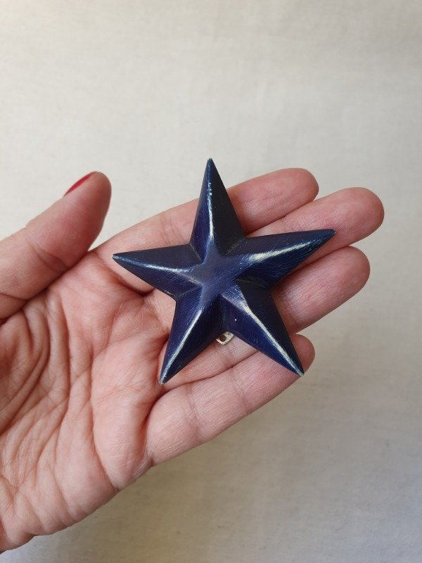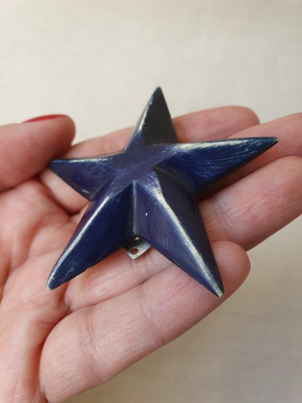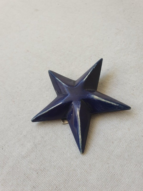 Clip de vestido Art Déco con forma de estrella de 5 puntas de baquelita coloreada en azul marino. Muy voluminosa, increible para usar como colgante y de 1000 maneras más. Mide 6 cm de punta a punta