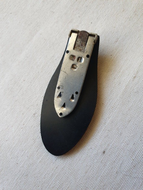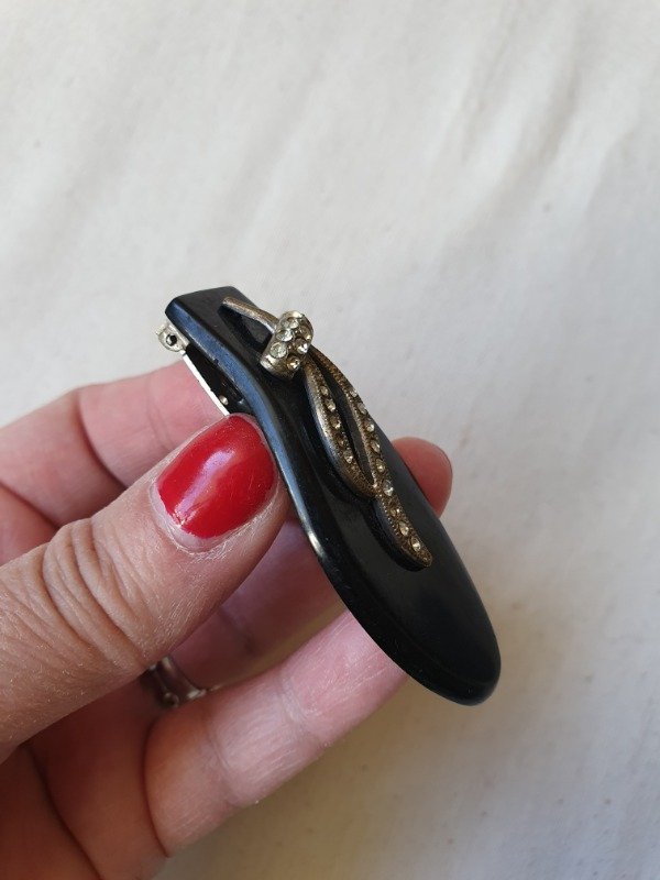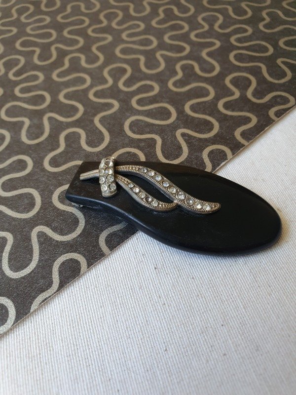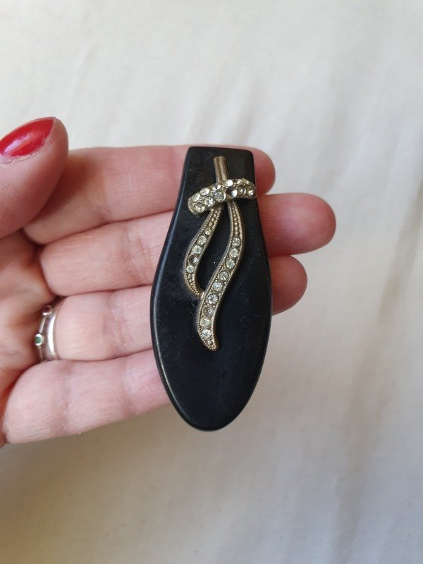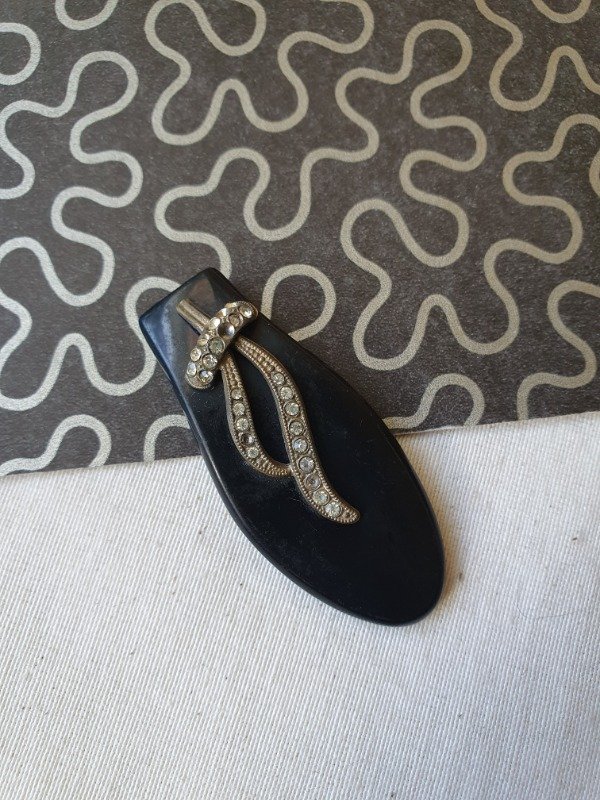 Clip de vestido Art Déco con forma ovalada en color negro, con detalle plateado de plumas cubierto de piedritas. Tiene ondulaciones que dan sensación de movimiento. Mide 6,5 cm x 2,5 cm