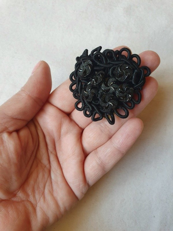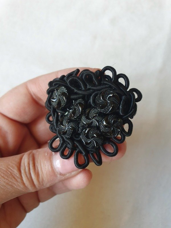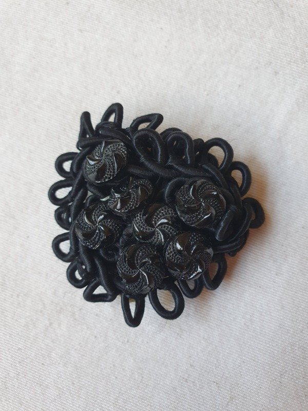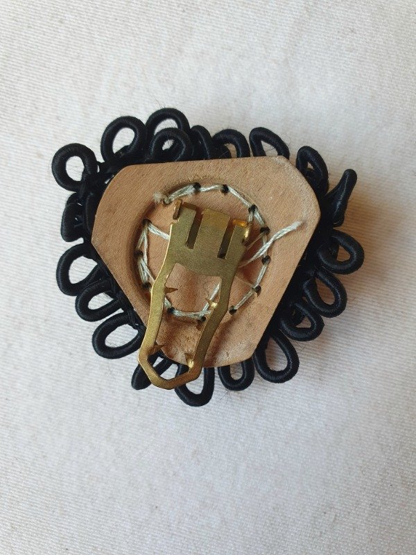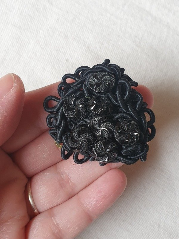 Clip de vestido años 30s. Triangular, revestido en pasamanería, soutache y cuentas de cristal negro con textura de espirales. El reverso es de madera y está cosido, al estilo de las piezas de Miriam Haskell