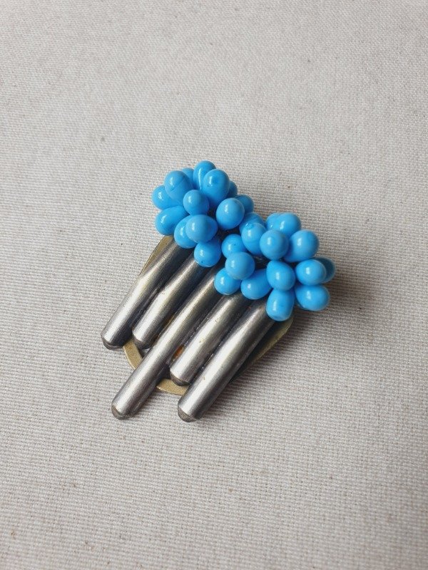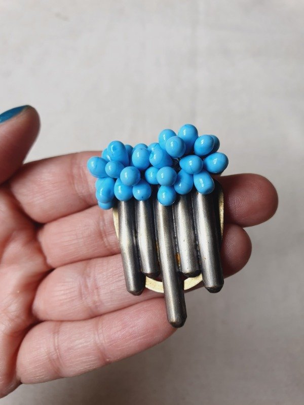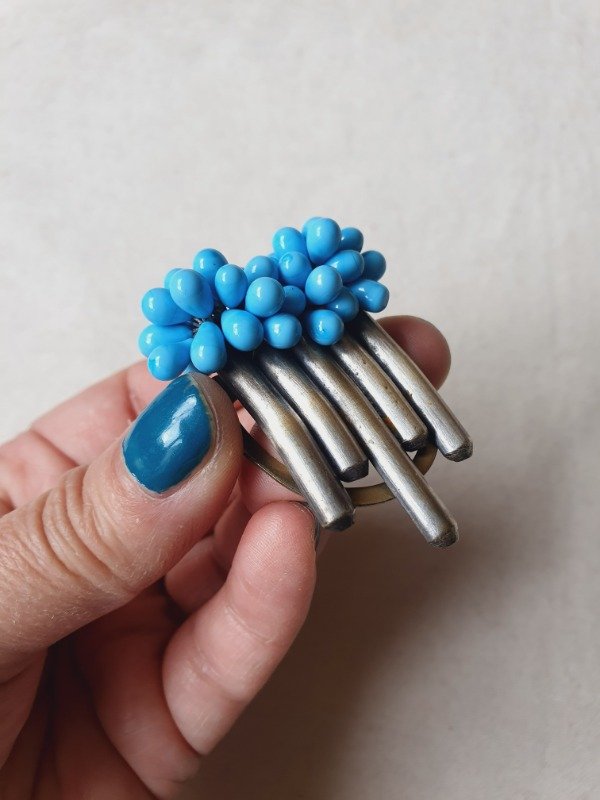 El modelo es de barras geométricas de metal plateado y está adornado por clusters de micro gotitas de cristal turquesa