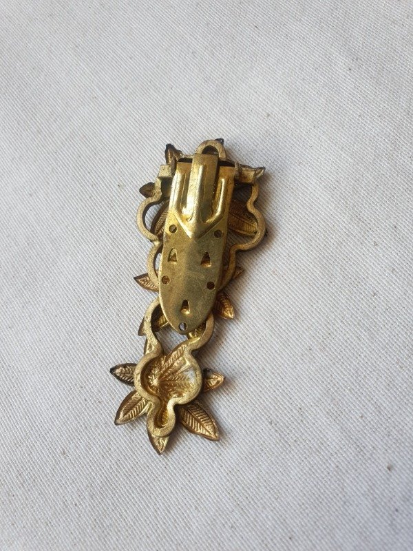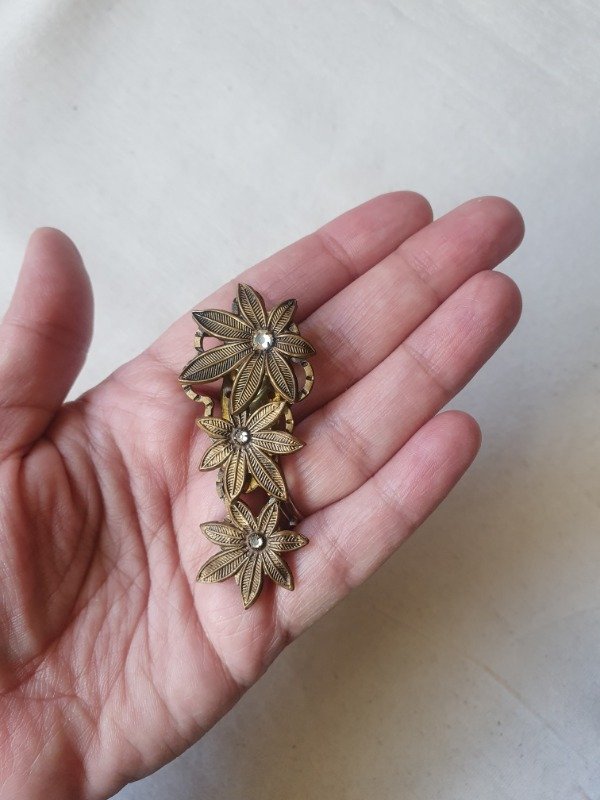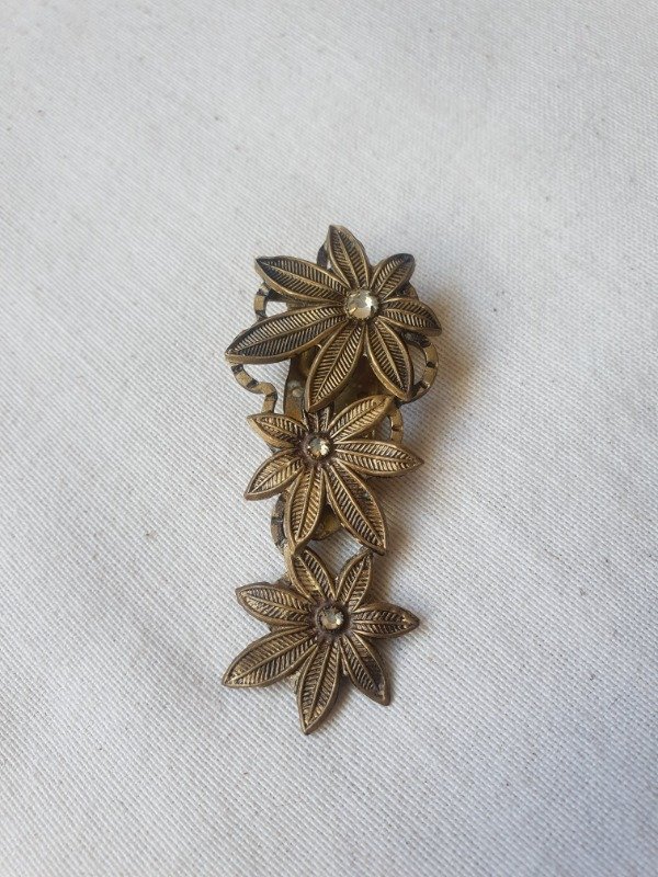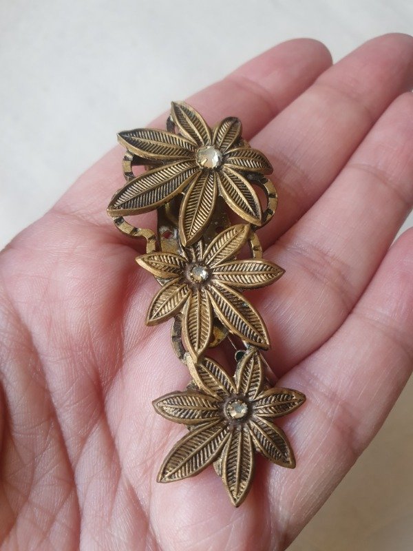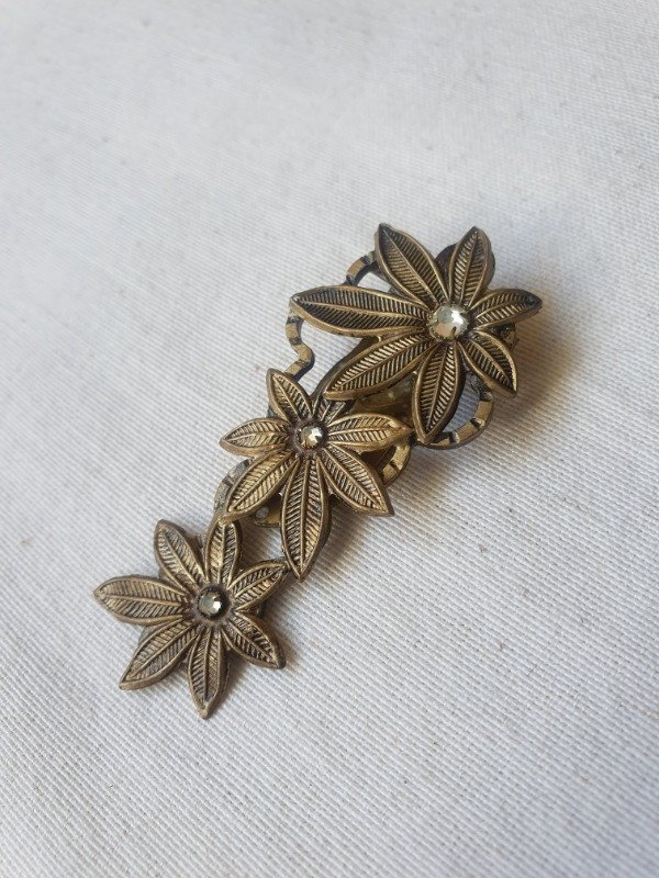 Clip de vestido Art Déco checo, alargado, con tres margaritas de bronce y pequeñas chispitas de cristal transparente en el centro. Muy hermoso de un tono y lustre envejecido. Mide 6 cm x 2,5 cm