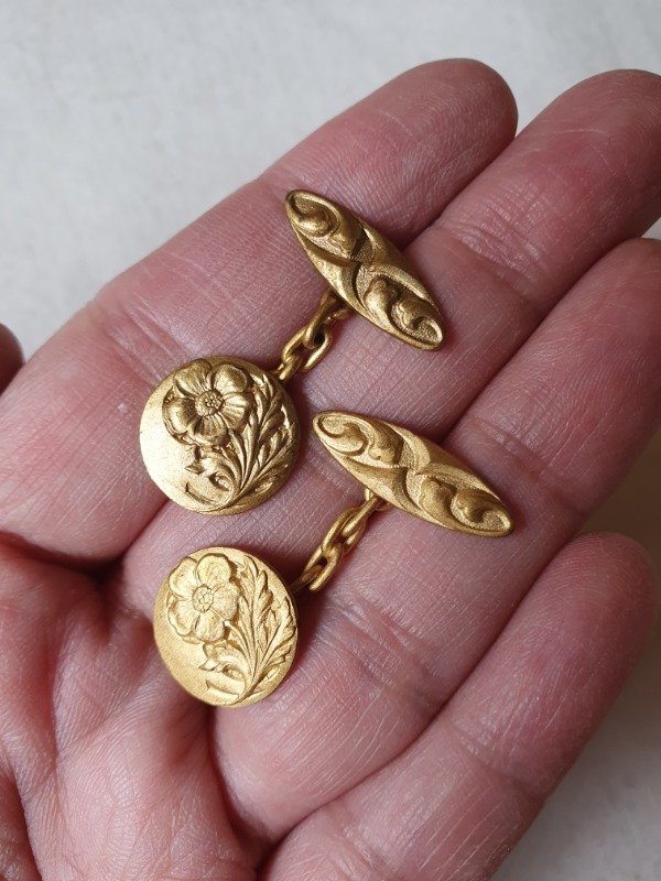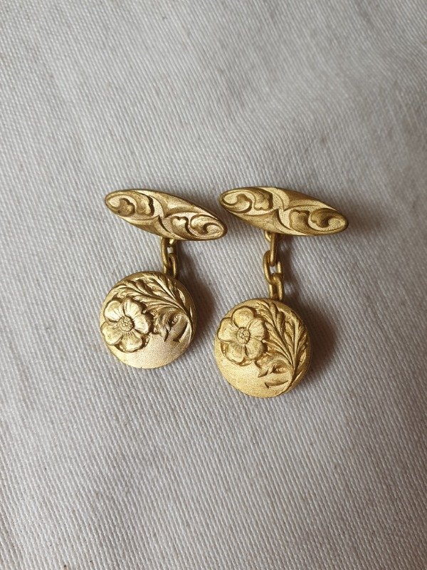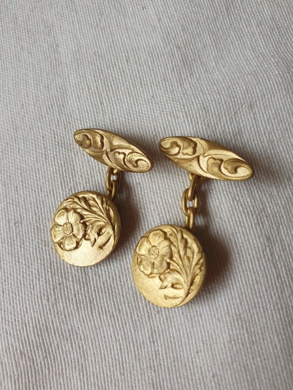 Gemelos Art Nouveau de principios del 1900, de calidad oro fix (sin sello), con el laminado de oro que se utilizaba a principios del siglo pasado, previo a nuestro actual enchapado. Miden 1,4 cm de diámetro ~ Par x 2