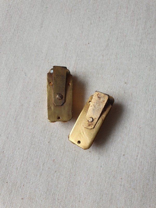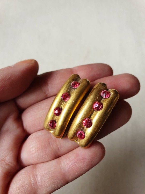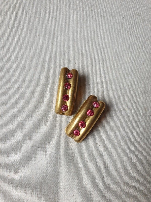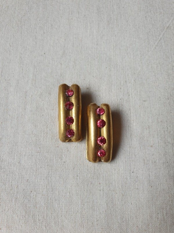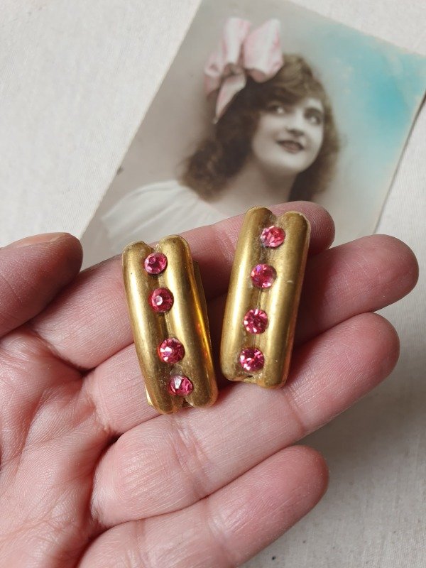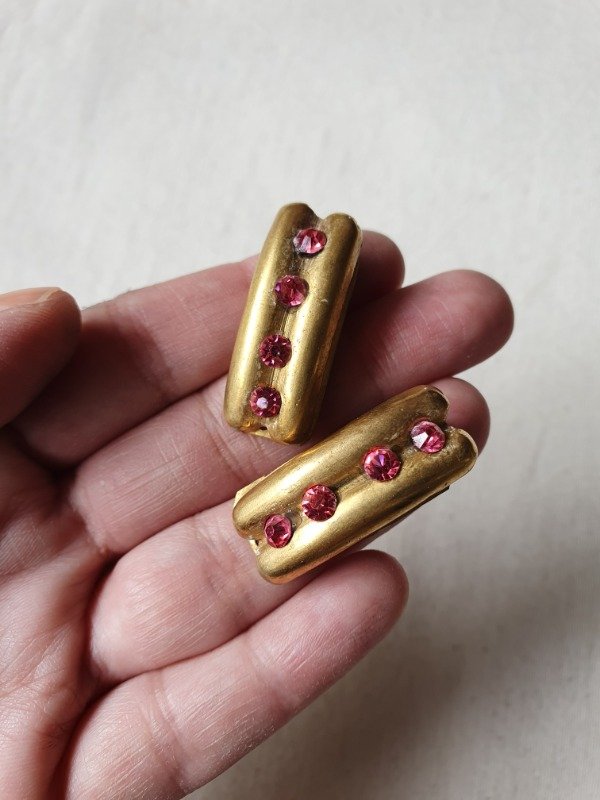Par (x2) de clips de vestido Art Déco de principios de los 20s, geométricos, de bronce macizo, levemente curvos y adornados por piedritas ultra brillantes rosadas. Son de los primeros clips, no tienen pinchecitos. Los mecanismos funcionan a la perfección y se sujetan a las prendas con fuerza. Miden 3 cm x 1,2 cm