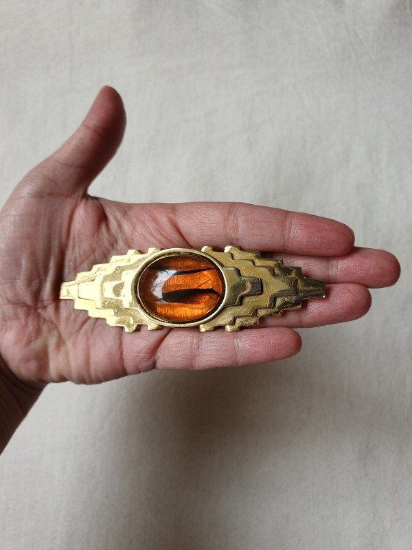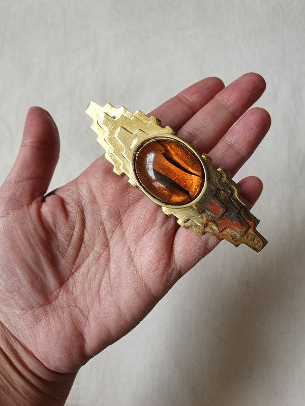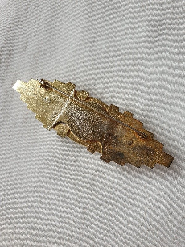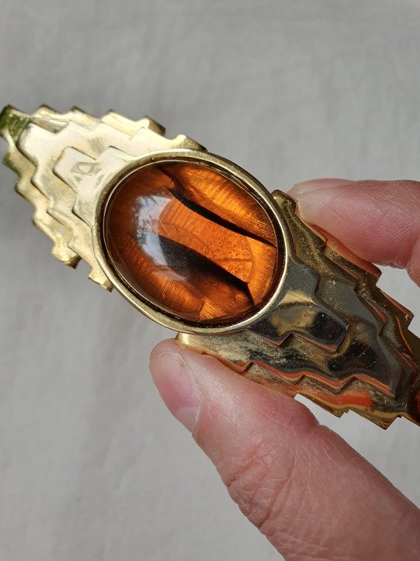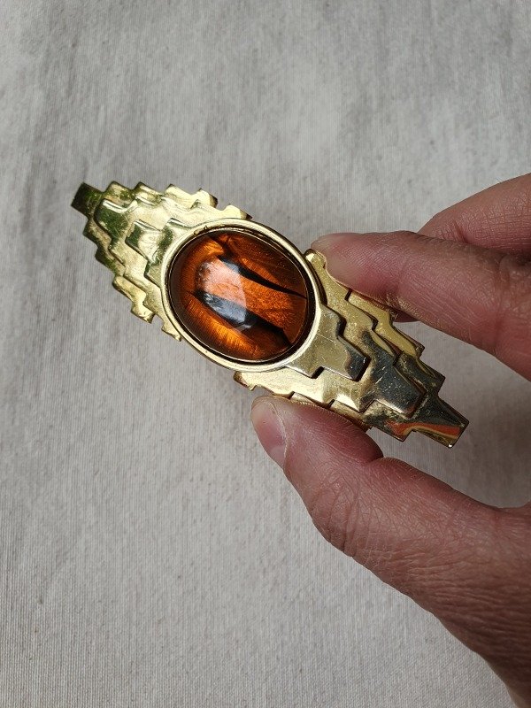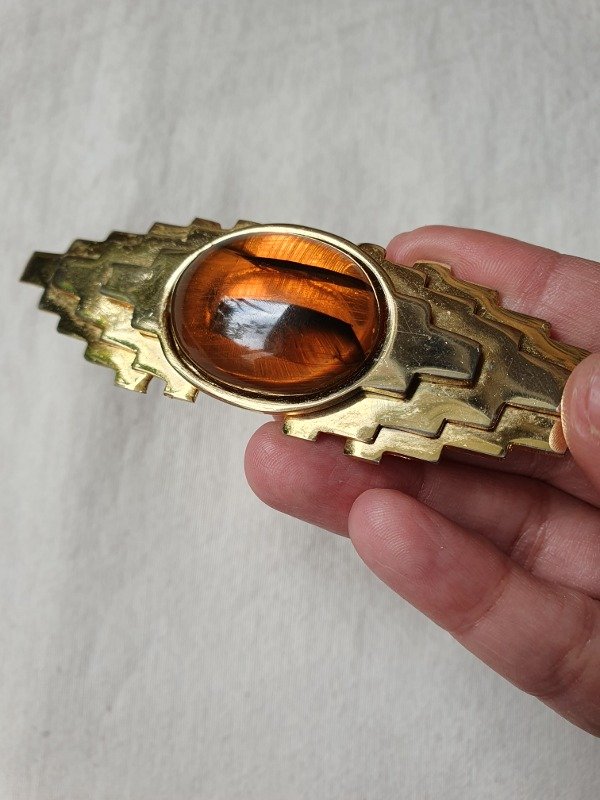Mega broche 80s de metal dorado faux deco con forma geométrica escalonada y simétrica con un cabochón de piedra sintética circular tipo ojo de tigre en el centro. Mide 10 cm x 3 cm y tiene traba de seguridad.