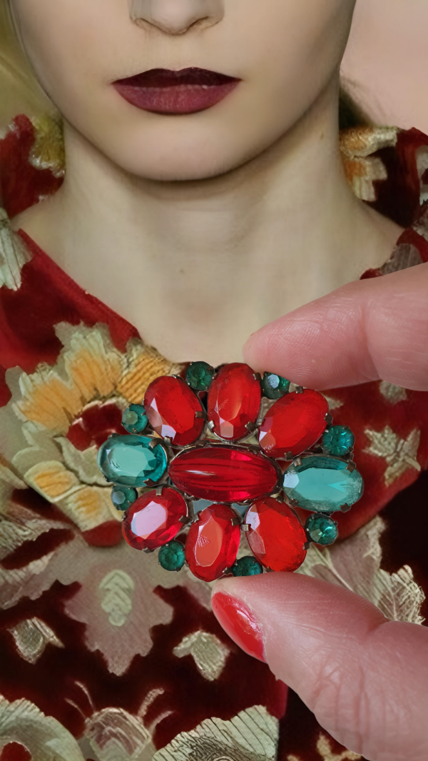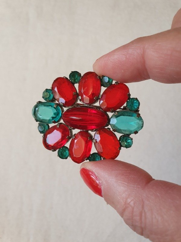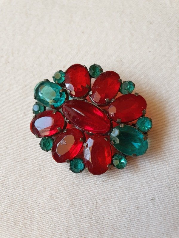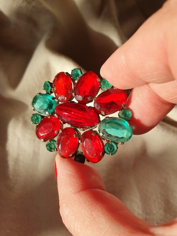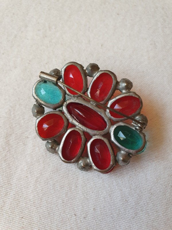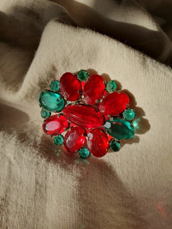 Broche años 30s-40s con cristales rojo rubí y verde esmeralda montados en openback sobre base plateada. Espectaculares los cristales. Mide 4,5 cm de diámetro y tiene cierre tipo “C”