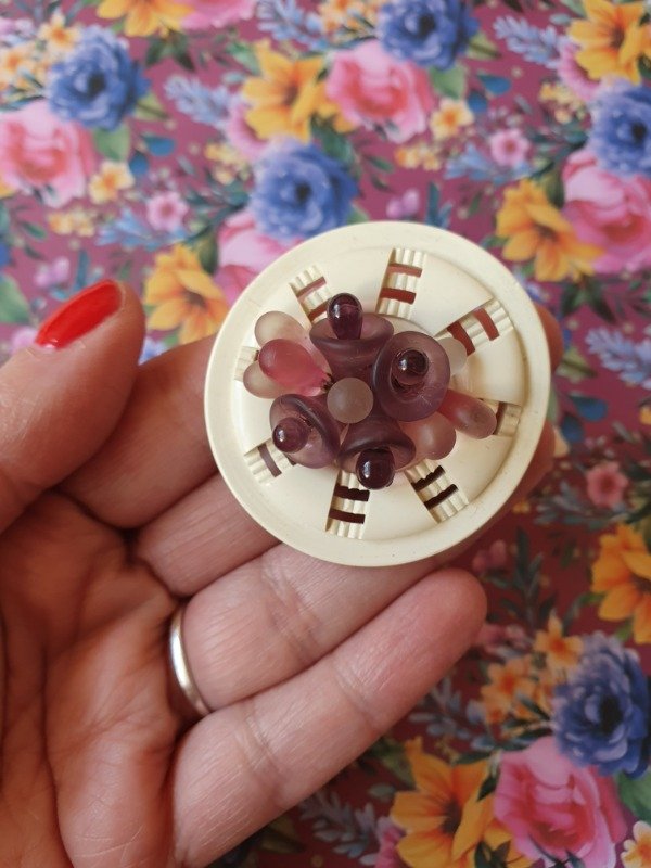 Prendedor de los años 30s con base circular, calada, con pétalos tallados o lisa de galalita, un material previo al plástico moderno, muy utilizado en su momento para hacer botones por su similitud con el m4rfil. La fórmula, a base de caseína y formol, se creó en el año 1903. Fue uno de los primeros plásticos orgánicos. Todo un tesoro encontrar este tipo de piezas.