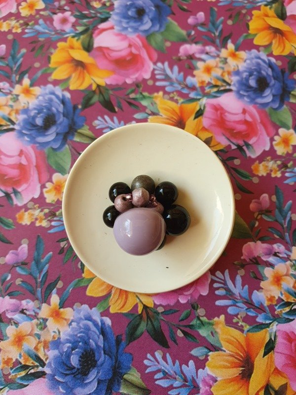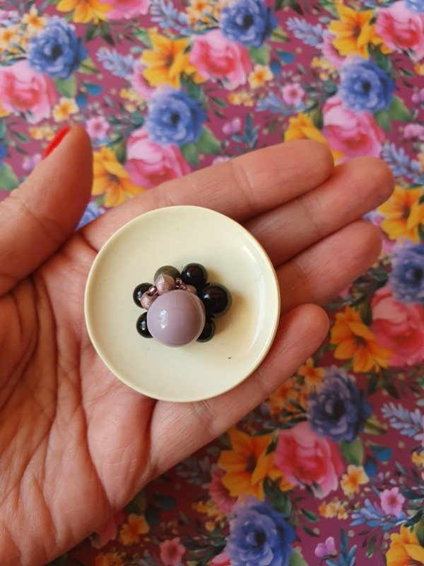 Prendedor de los años 30s con base circular, calada, con pétalos tallados o lisa de galalita, un material previo al plástico moderno, muy utilizado en su momento para hacer botones por su similitud con el m4rfil. La fórmula, a base de caseína y formol, se creó en el año 1903. Fue uno de los primeros plásticos orgánicos. Todo un tesoro encontrar este tipo de piezas.