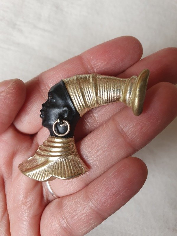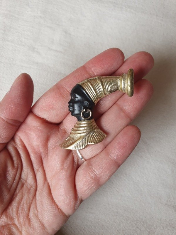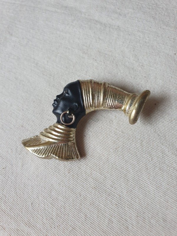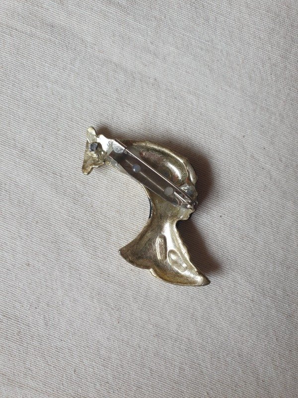 Broche figura de mujer esmaltada en negro, con turbante y collar plateados y aro argolla colgante movible. El cierre fue reemplazado por uno actual.