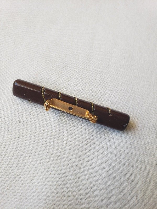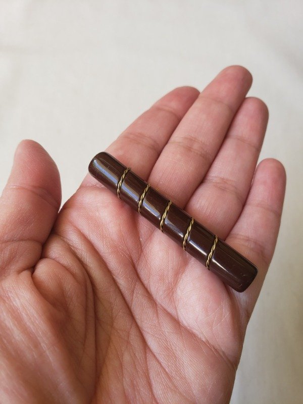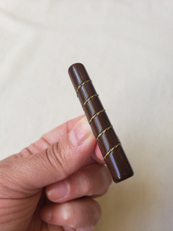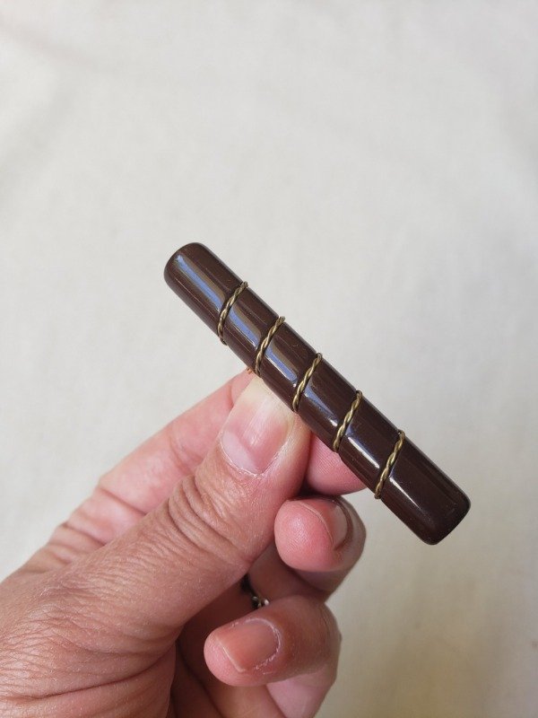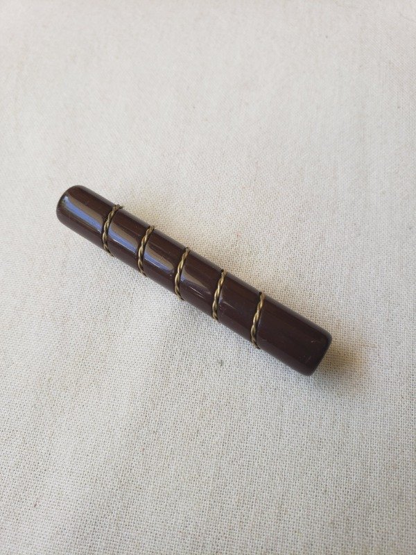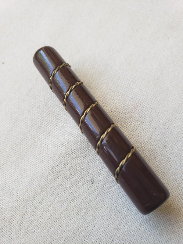 Prendedor de baquelita color chocolate tipo habano, cilíndrico, con detalle dorado. Mide 5,5 cm de longitud x 0,5 cm de diámetro. Divino