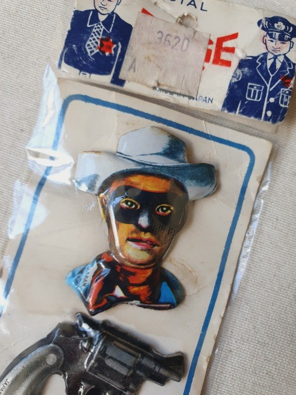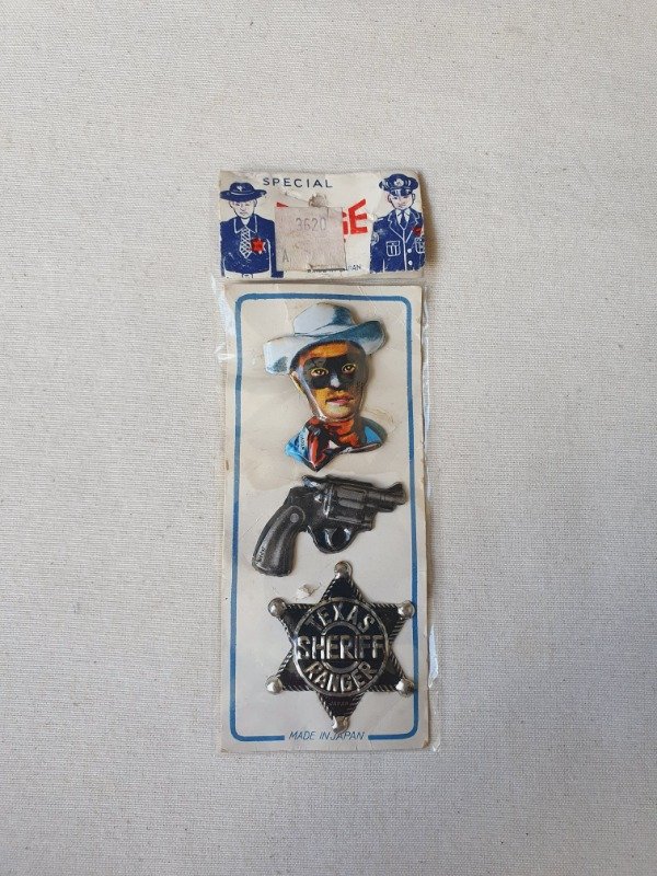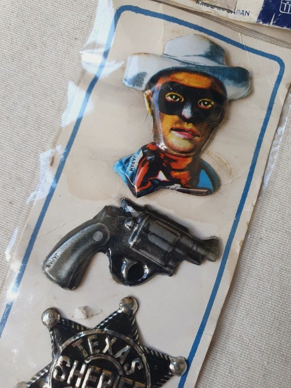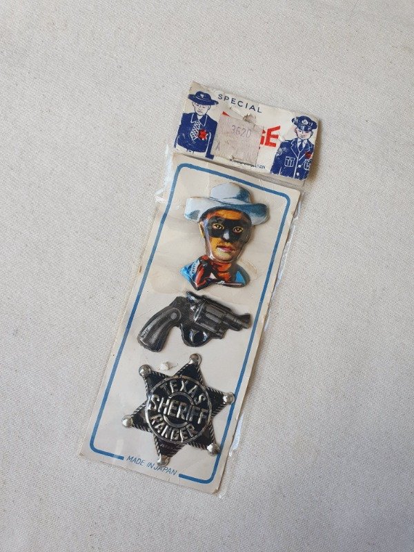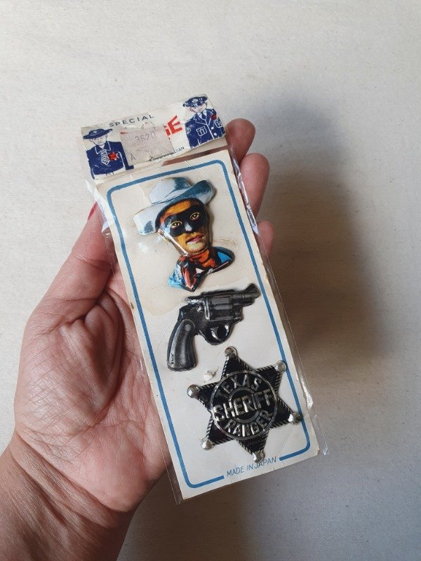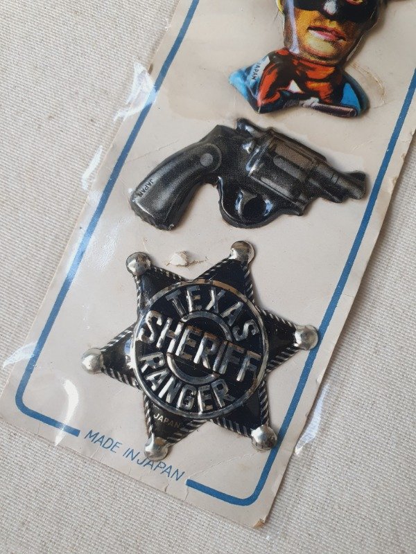 Set de tres prendedores japoneses de lata litografiada del Llanero solitario. Vienen: el llanero, una pist0la y la estrella de Sheriff. Vienen en su blister original cerrado y cada prendedor mide 4 cm aprox.