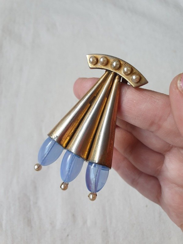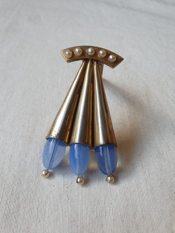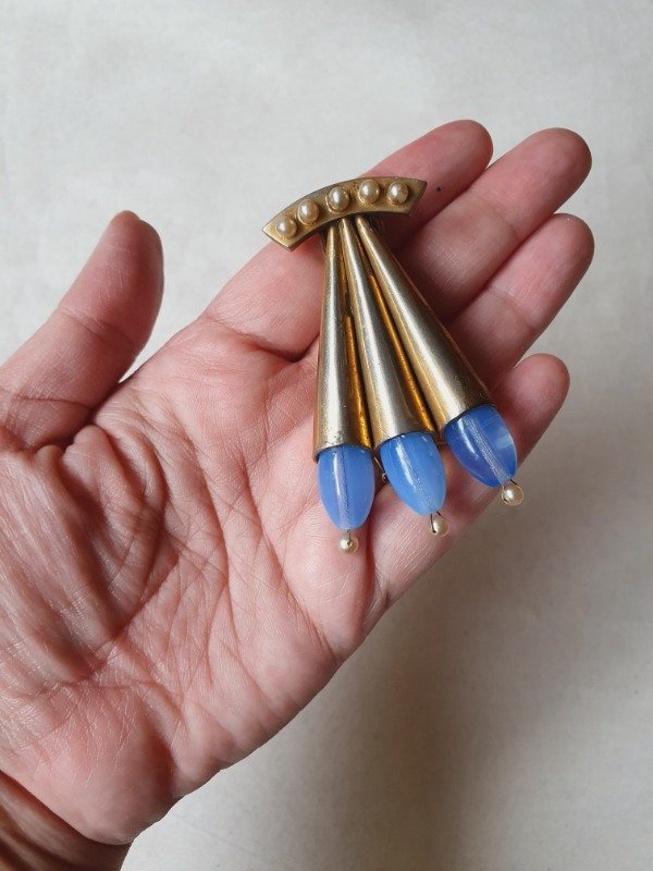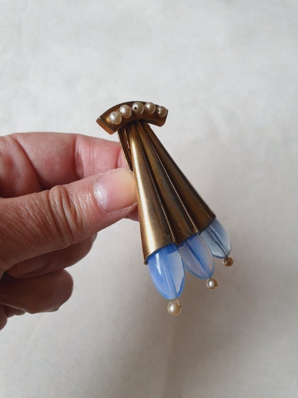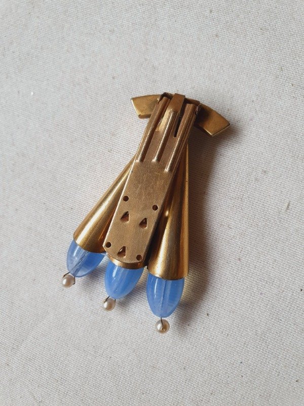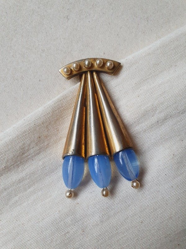 Clip de vestido de los 20s-30s Art Déco Egyptian Revival, con forma de flor de papiro en metal dorado muy brillante. Tiene tres piezas de cristal ovaladas, traslúcidas en tono celeste que son una maravilla única y remata con microperlitas. Algo que no se ve todos los días. Una verdadera joya, muy impactante. En el dorso tiene el clip con pinches para sujetarlo a las prendas y está sellado Made in France. Se puede usar como colgante si le pasan una cadena al clip. Mide 6,5 cm x 4 cm